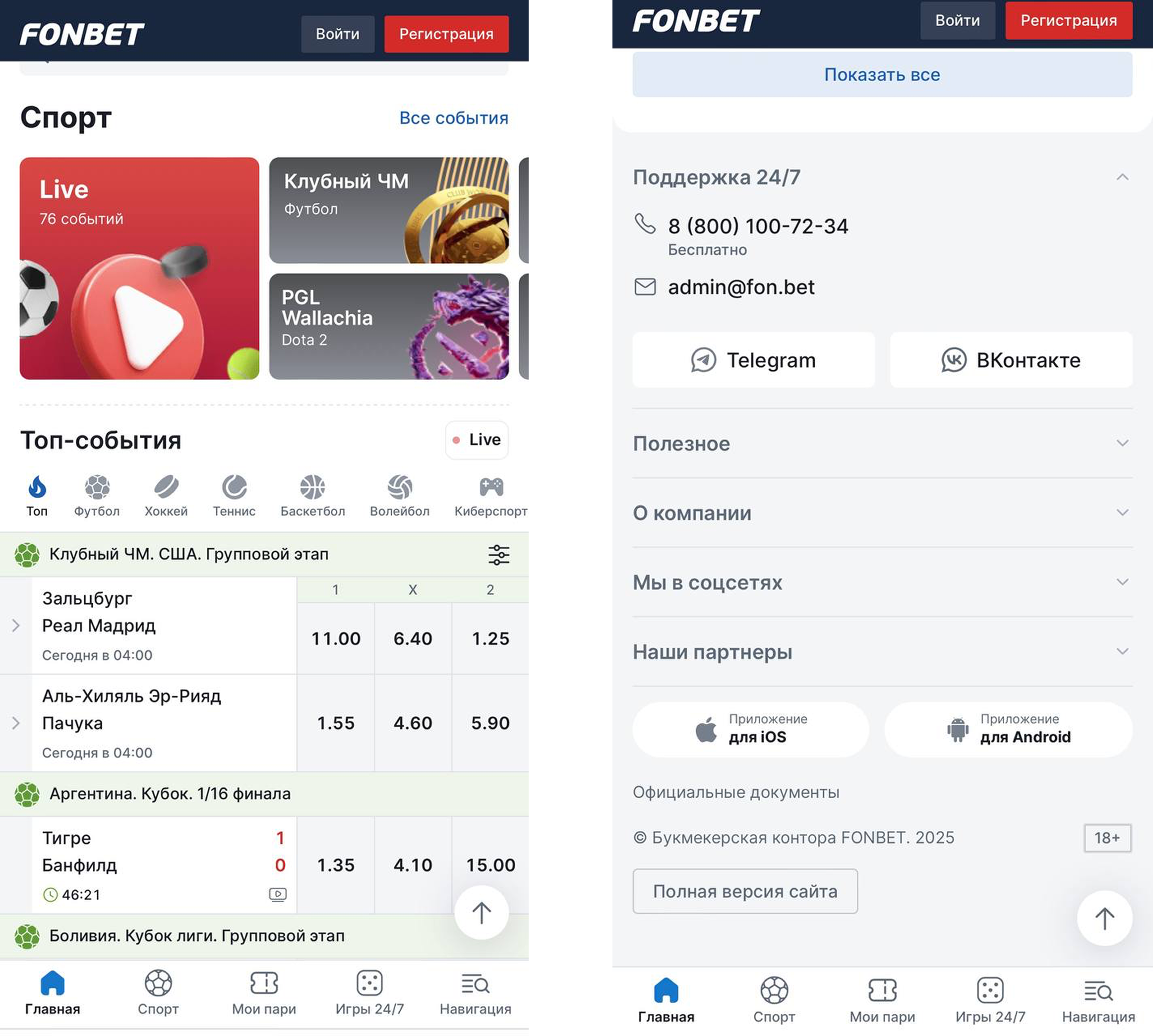 В нижней части главного экрана представлена информация о партнерах букмекерской компании «Фонбет», телефон и адрес электронной почты для связи со службой поддержки, а также ссылки на официальные аккаунты букмекера в социальных сетях.