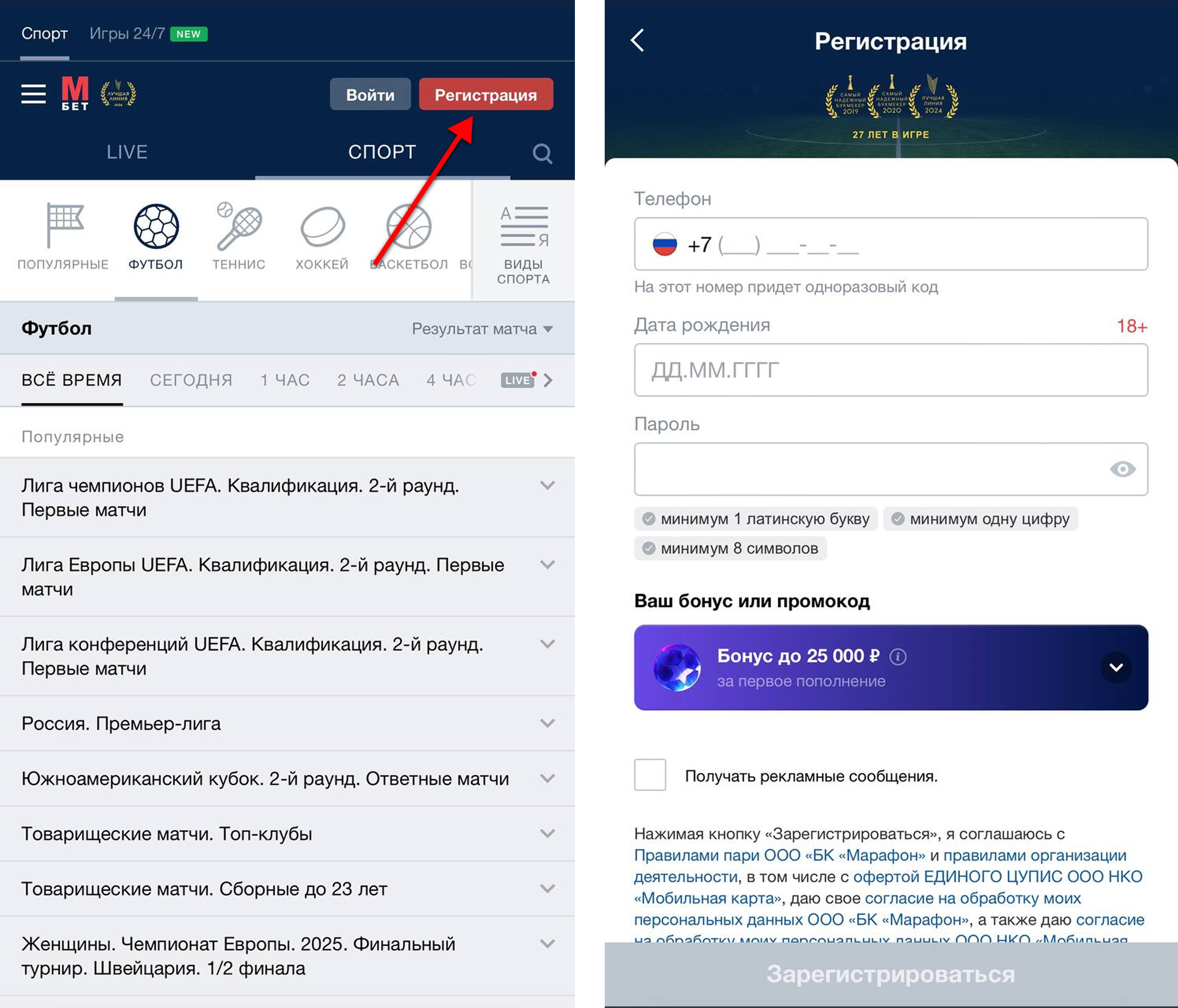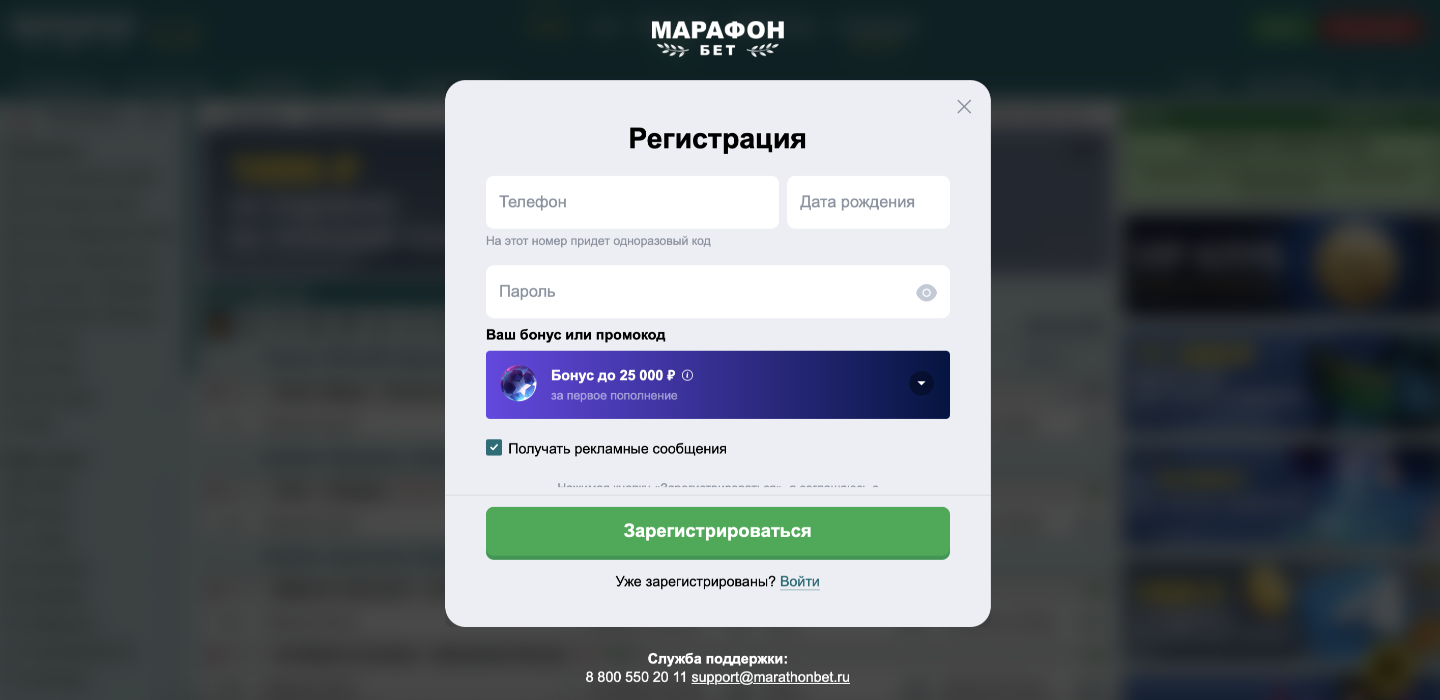 Регистрация на «Марафон» — быстрый и простой процесс, который позволяет вам начать делать ставки на спортивные события. Выберите удобный способ регистрации — через сайт, мобильное приложение на Android или iOS, и следуйте инструкциям. Учтите, что для полноценной игры возможно потребуется прохождение верификации личности.