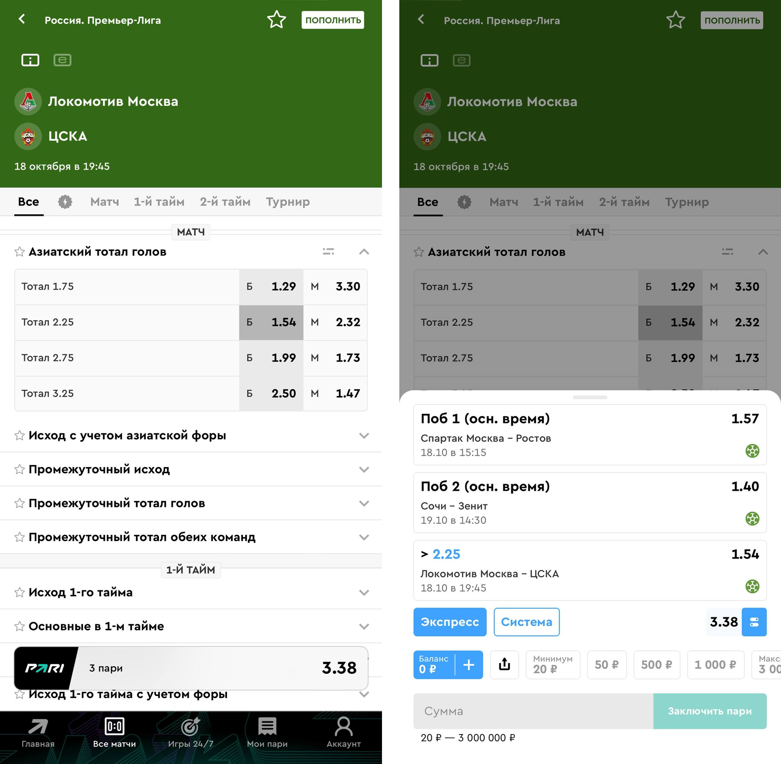 Возьмем матч «Локомотив» — ЦСКА. На ТМ 2,25 букмекер предлагает коэффициент 2.32, а на ТБ 2,25 — 1.54.