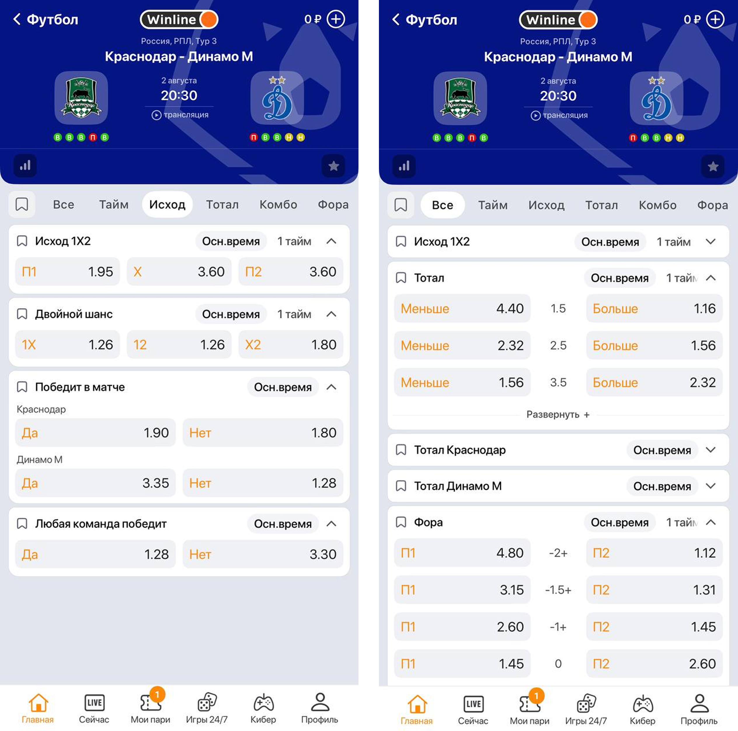Примеры исходов, тоталов и фор в линии футбольного матча: