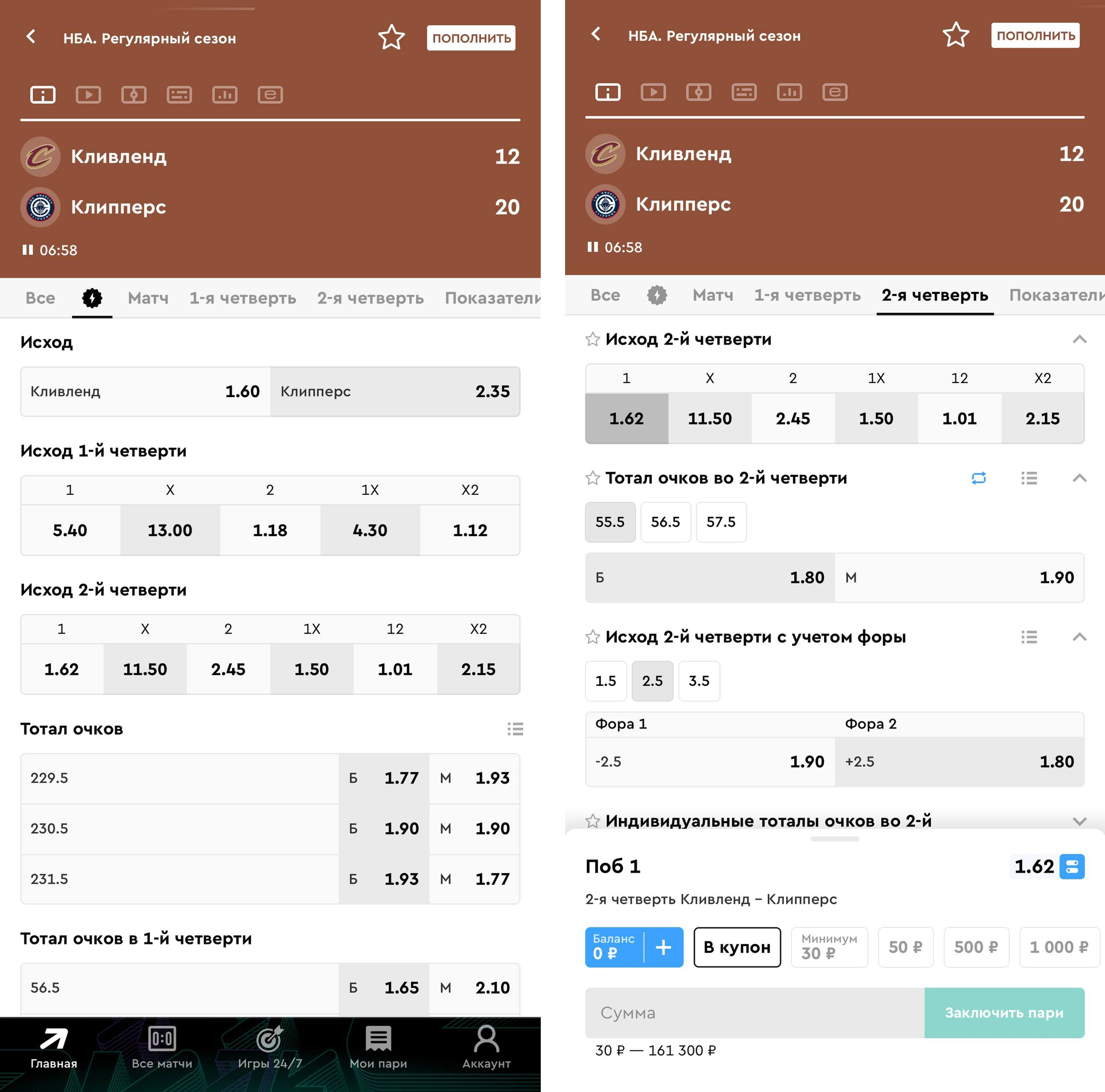 Второй подход предполагает ставку на победу фаворита в одной из четвертей. Даже если аутсайдер неожиданно выигрывает матч, фаворит все равно может взять верх хотя бы в одном из игровых отрезков. Например, в матче «Кливленд» – «Клипперс», если гости неожиданно лидируют в четверти, коэффициент на победу хозяев на остаток матча или конкретную четверть может вырасти вплоть до 1,90, что делает такую ставку привлекательной.
