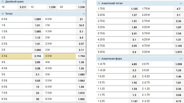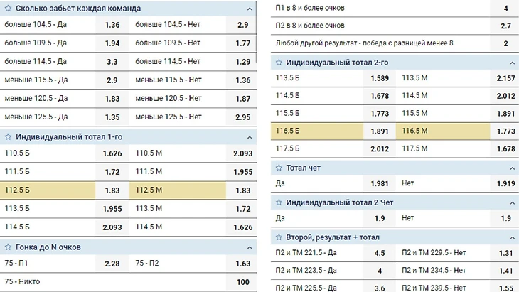 Баскетбол: в играх очки набираются гораздо быстрее, поэтому тоталы здесь выше. Допустим, вы ставите на индивидуальный ТБ первой (116,5) или второй (112,5) команды в матче НБА. Это значит, что для выигрыша вам нужно, чтобы обе команды вместе набрали заданное или более очков.