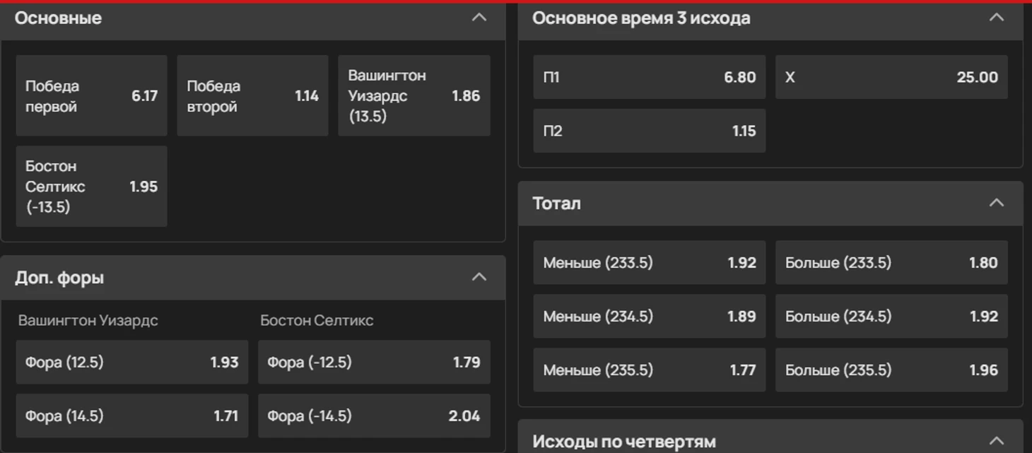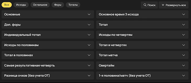 Итак, что вообще может быть предложено в баскетбольном матче? Разумеется, первым идет исход встречи. В баскетболе ничьих не бывает, поэтому обязательно будет вариант с победой одной из команд. Можно поставить как на победу по итогам всей встречи (и неважно, в овертайме или нет), так и на то, кто выиграет в текущей четверти в live-режиме.