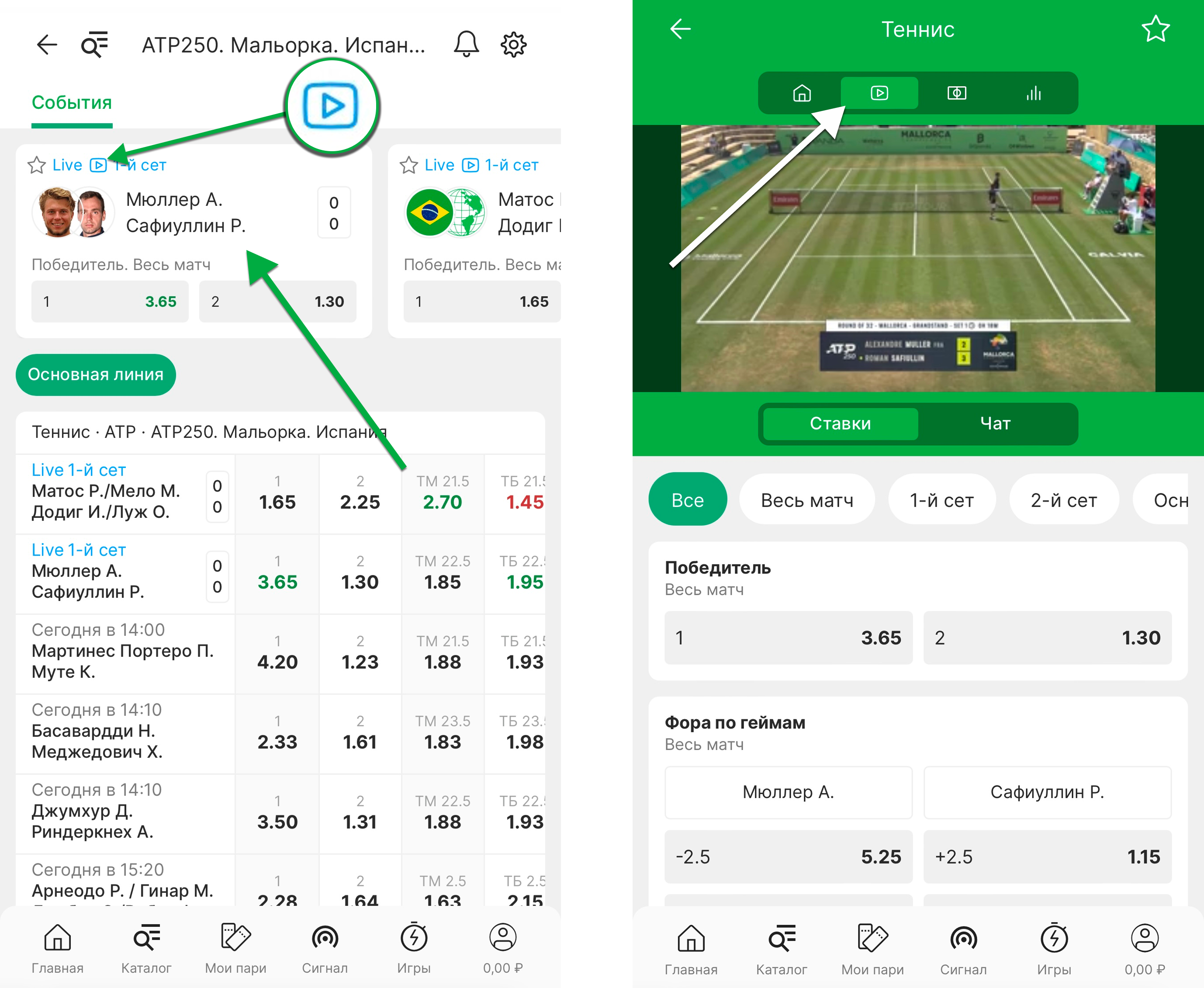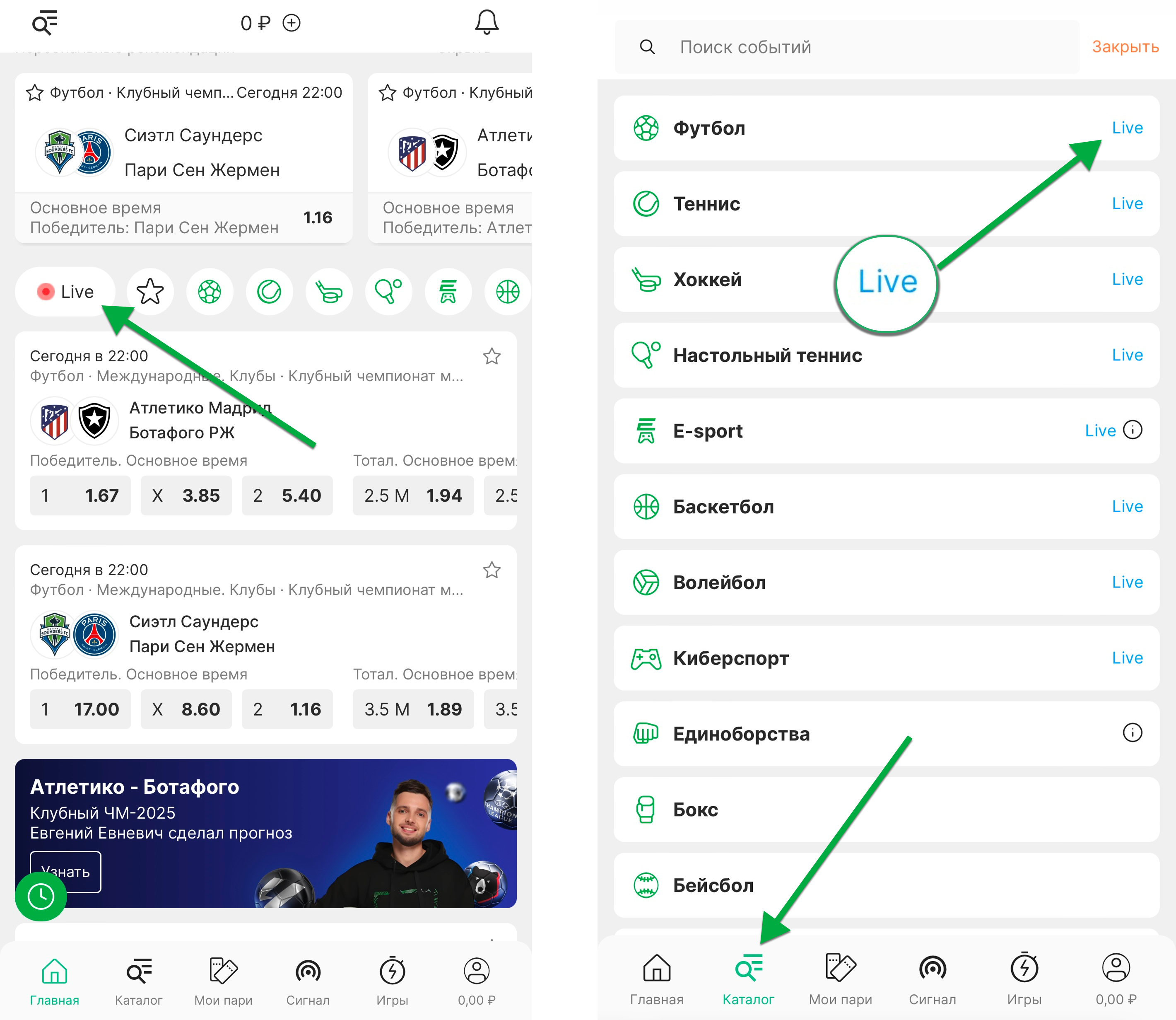 «Лига Ставок» предоставляет пользователям возможность делать ставки в режиме реального времени на широкий выбор событий. В разделе Live можно фильтровать матчи по видам спорта и находить прямые трансляции игр в разделе Live или «Каталог».