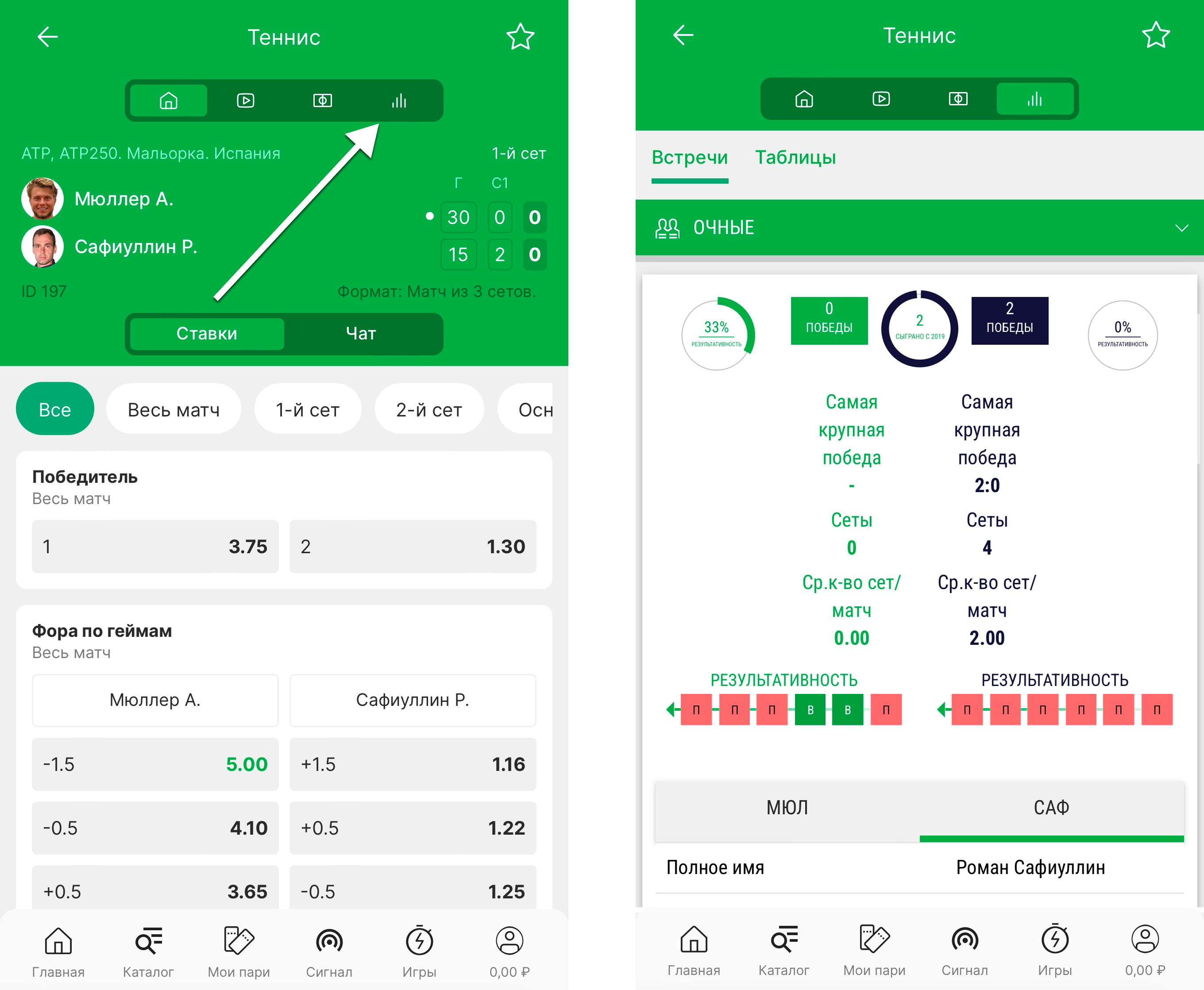 В Live разделе БК «Лига Ставок» можно делать ставки на теннисные матчи с различными вариантами исходов: