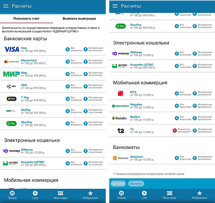 БК «Бетсити» руководствуется стандартным набором правил, при пополнении и выводе денежных средств. В личном кабинете компании доступны наиболее распространенные способы пополнения и снятия – от банковских карт до терминала. Аналогичные условия вы найдете среди большинства легальных букмекеров в РФ.