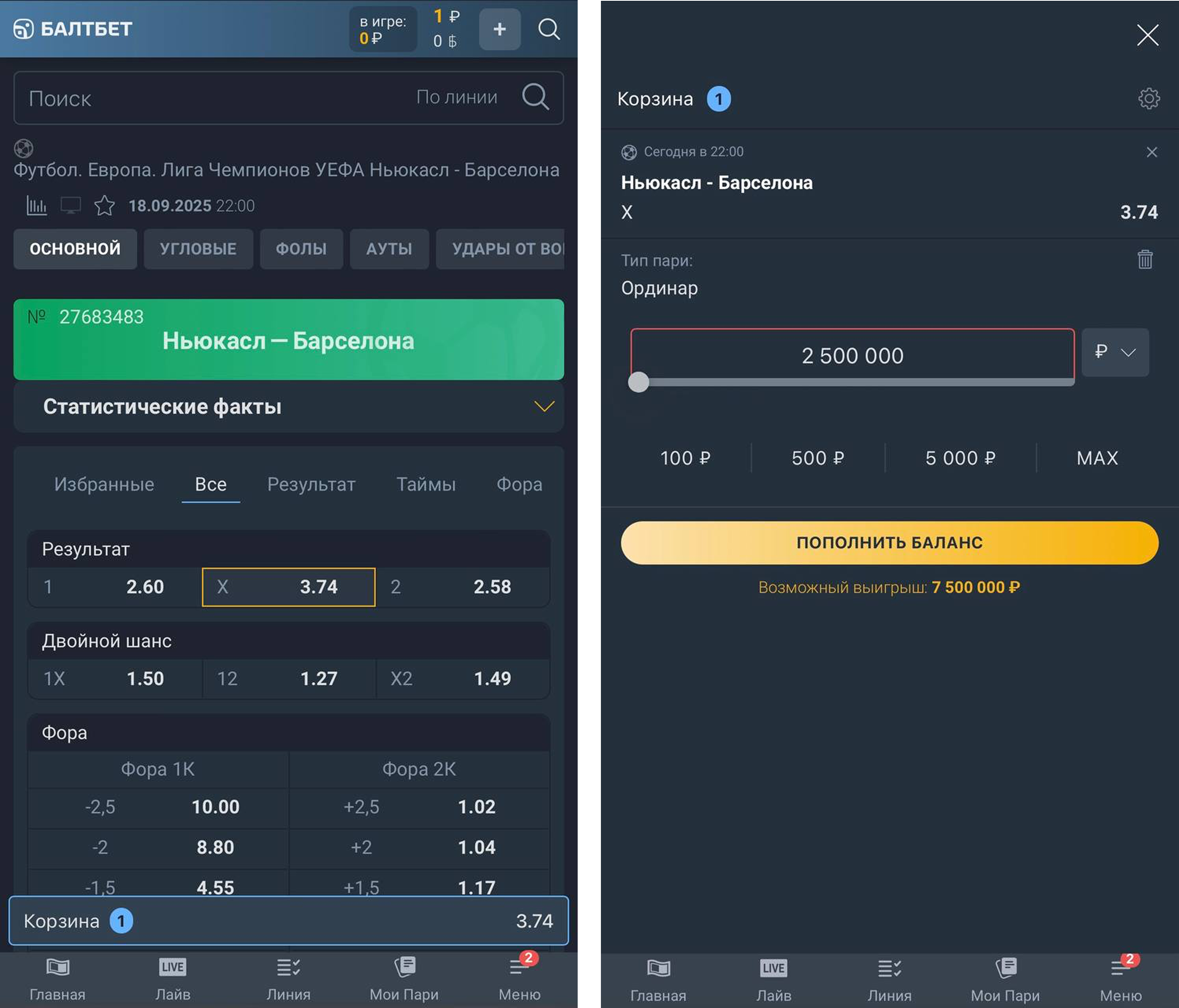 Чтобы сделать максимальную ставку в «Балтбет», выполните следующие шаги: