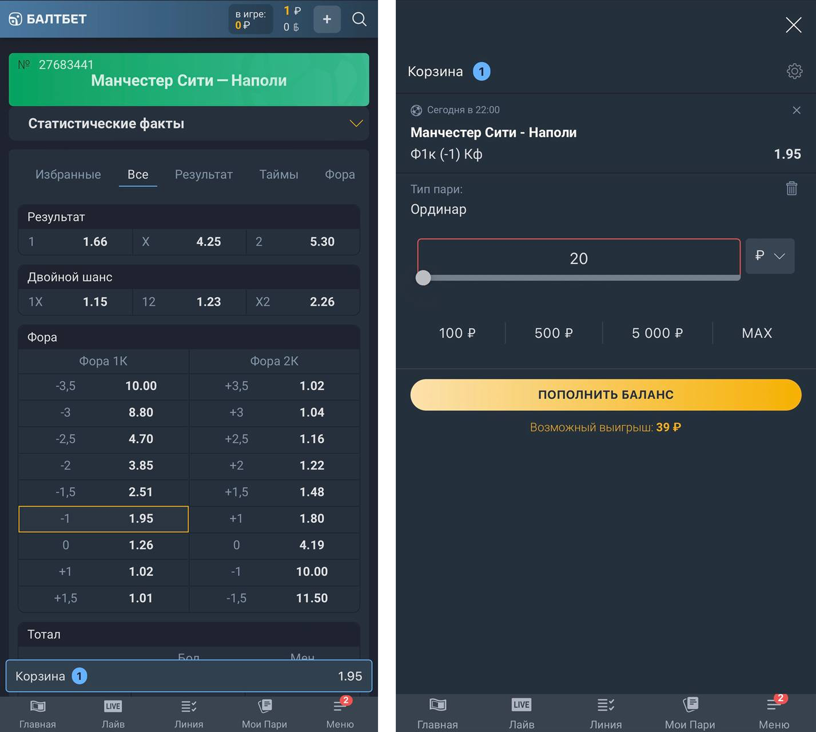 Чтобы поставить минимальную ставку в 20 рублей в мобильном приложении «Балтбет», выполните следующие шаги: