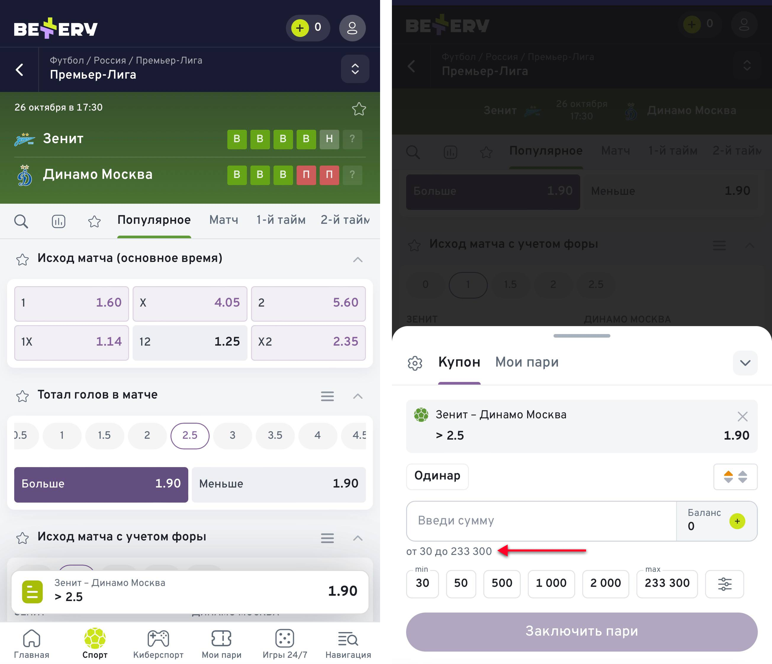 Эти значения могут изменяться, так как Bettery оставляет за собой право корректировать лимиты. При добавлении исхода в купон игрок видит минимальную сумму ставки рядом с полем ввода суммы.