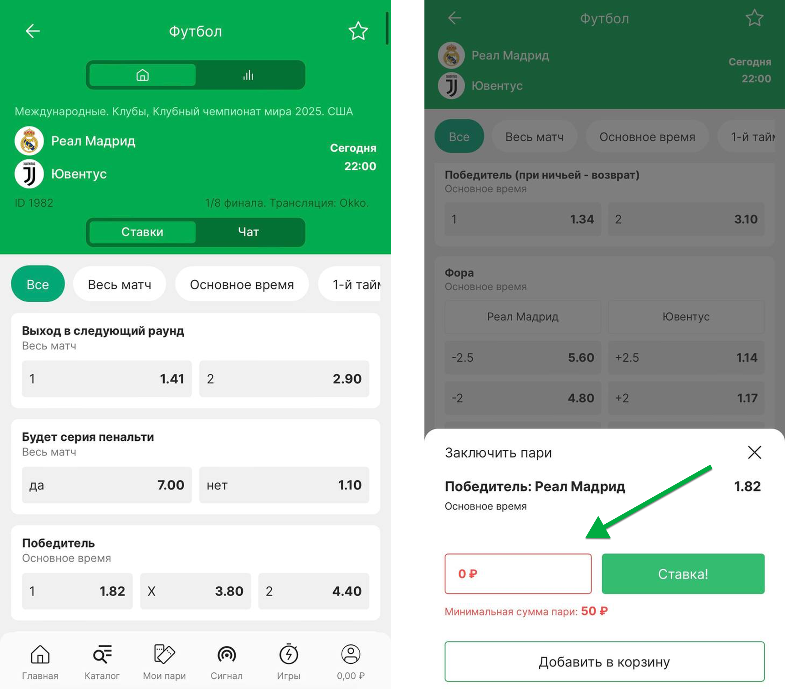 Выберите событие и рынок, нажмите на коэффициент.