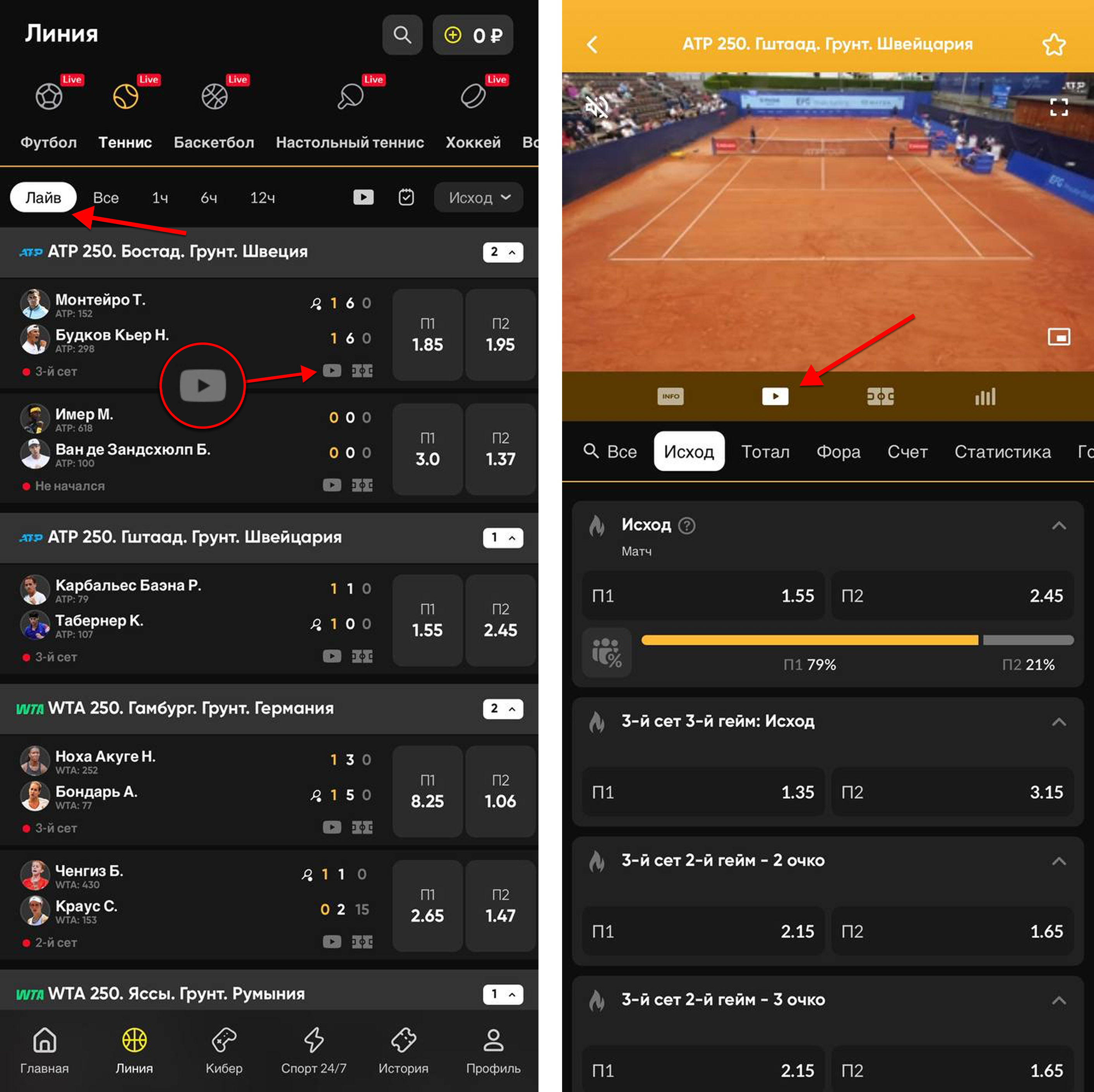 Выбрать интересующее событие. У всех матчей с онлайн-трансляциями отображается специальная иконка с кнопкой Play