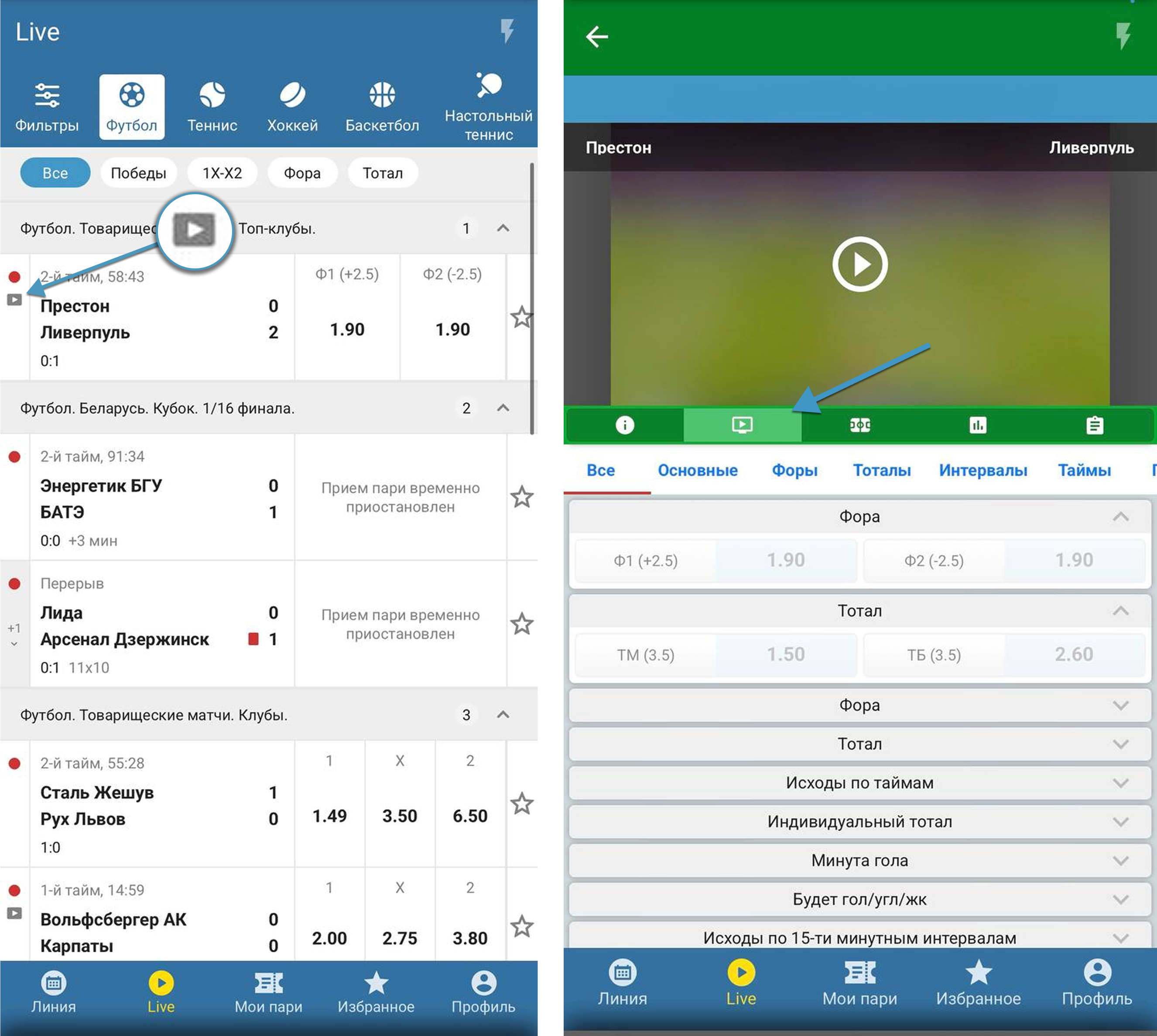 Перейдите к списку матчей в разделе «Live».