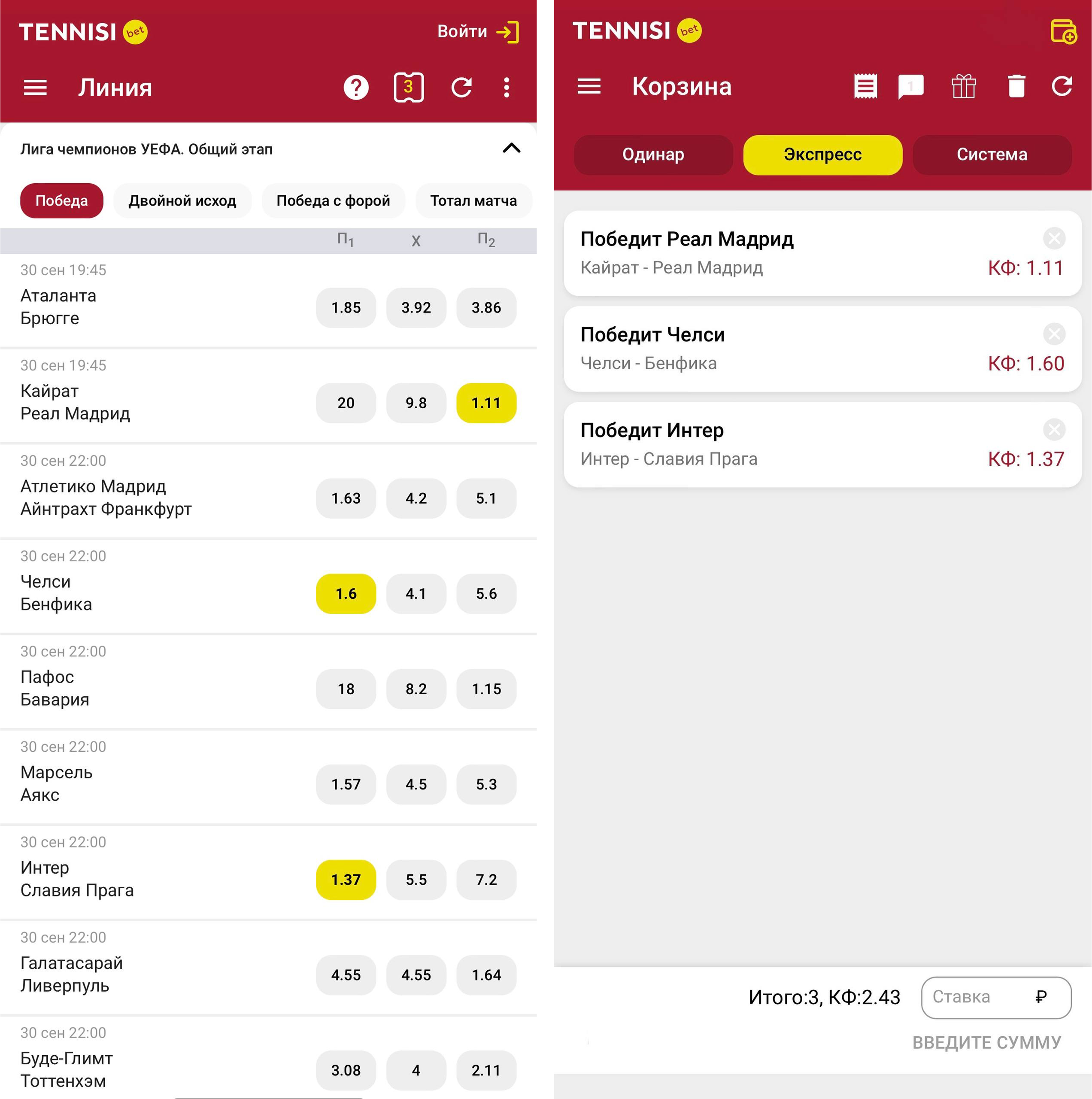 Приложение Tennisi для устройств на базе Android и iOS предоставляет те же возможности, что и мобильная версия сайта. Вы можете создавать экспресс-ставки, выбирая матчи из различных видов спорта, и заключать пари всего в несколько кликов.