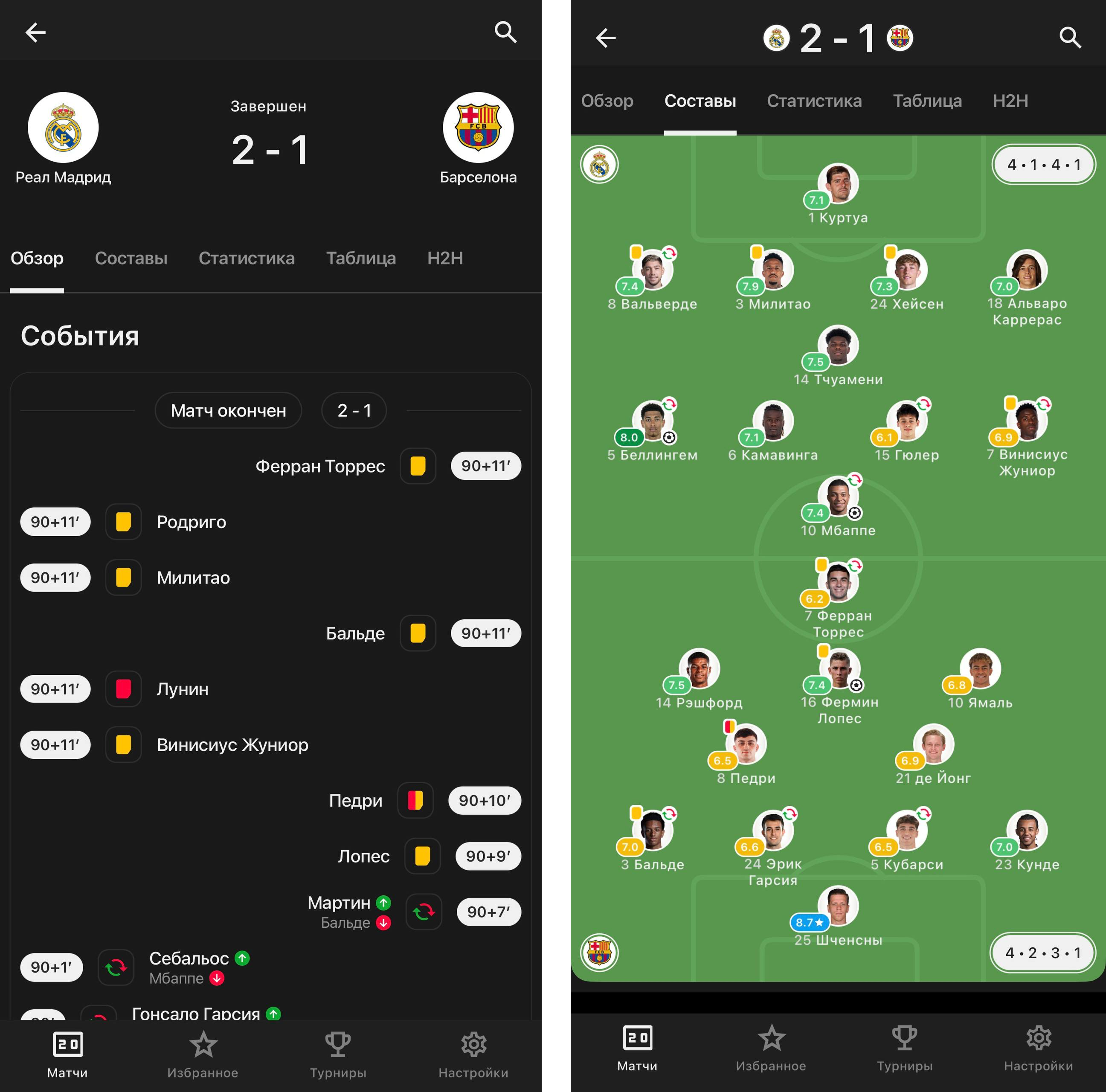 Каждый матч сопровождается подробной информацией: составы команд, данные о голах, заменах, предупреждениях, пенальти и видеоповторах.