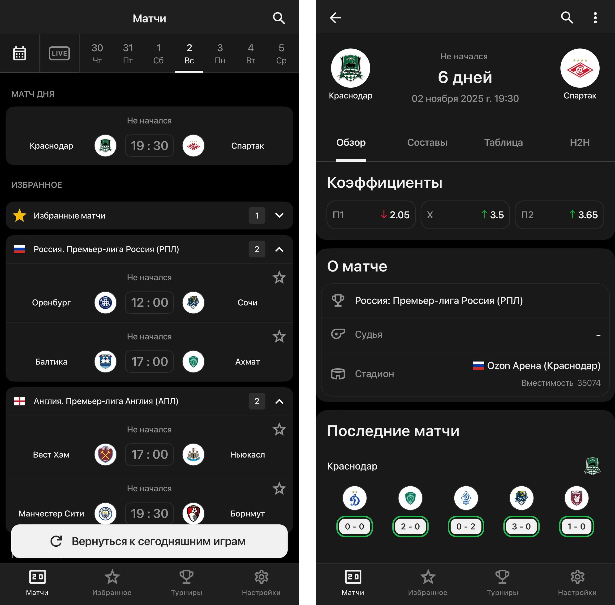 Календарь матчей — еще один важный элемент приложения. С его помощью можно заранее посмотреть, какие игры пройдут сегодня, завтра или через несколько дней. Из удобства — при переключении на другой день приложение держит под рукой кнопку «вернуться к сегодняшним играм».
