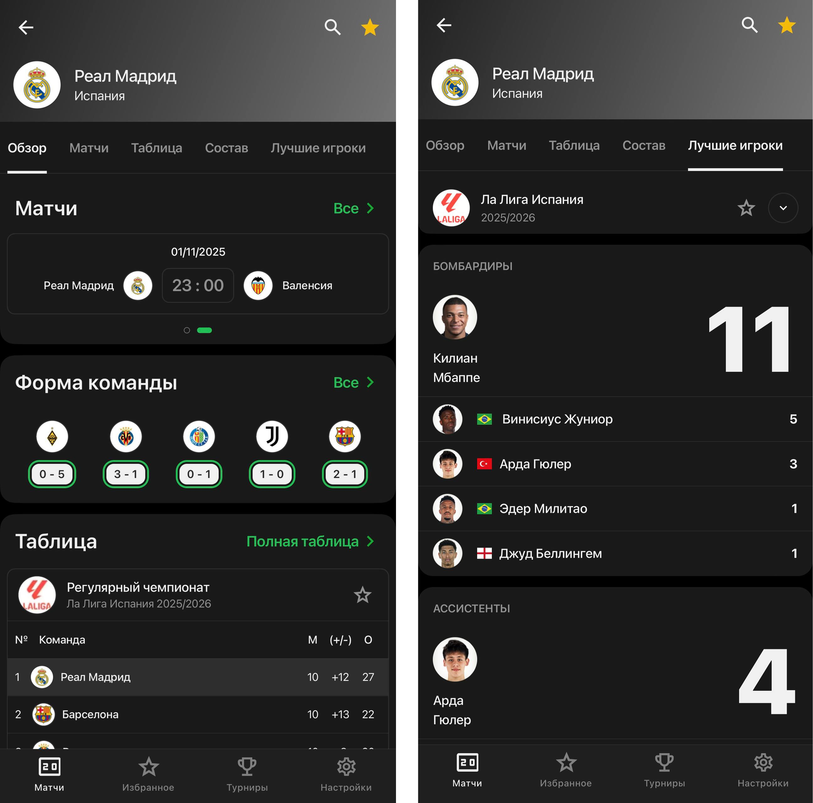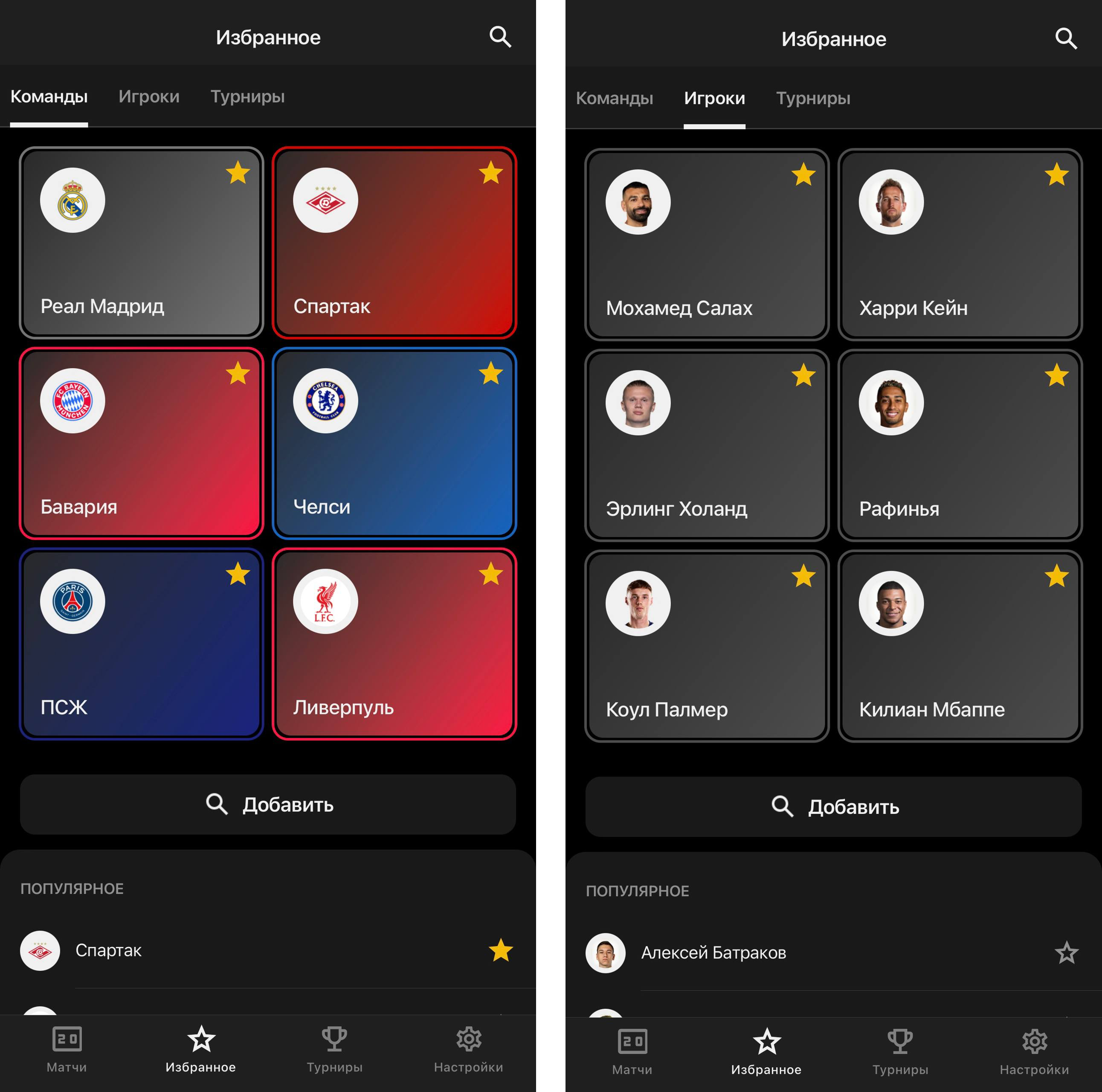 Особого внимания заслуживает вкладка «Избранное». Сюда можно добавлять как конкретные команды, так и целые турниры. Это позволяет формировать персонализированную ленту — все самые важные для пользователя события отображаются в одном месте. Также, в отличие от многих других сервисов, «ГОЛ» предлагает не просто фиксированный список популярных турниров, а возможность вручную настраивать свой спортивный поток.