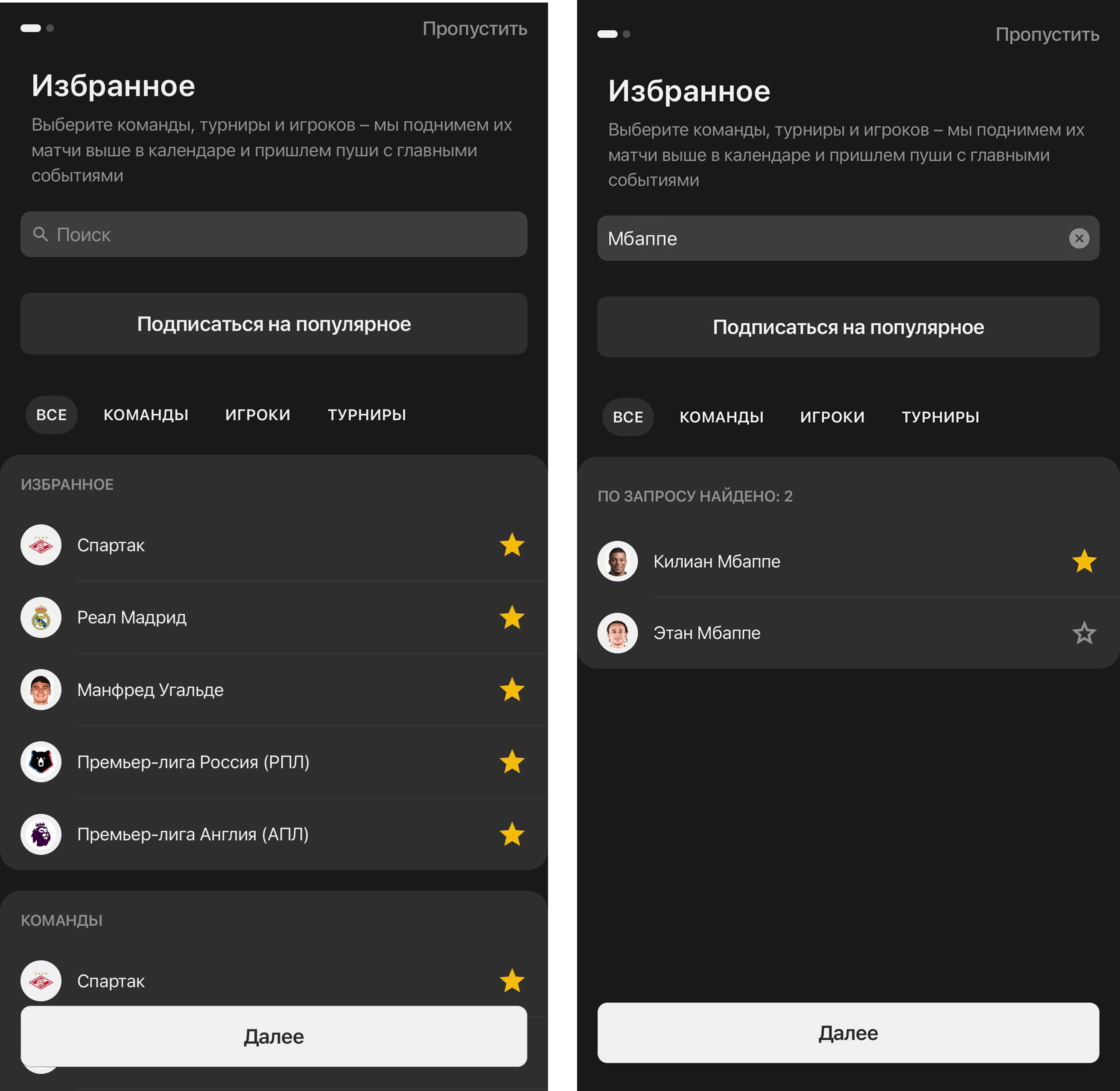 Сразу после установки и открытия приложения пользователю предлагается выбор своих фаворитов в футбольном мире. Вы можете следить как за конкретным игроком, так и за клубом или турниром.