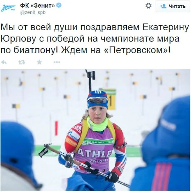 Футбольный клуб «Зенит» поздравил биатлонистку Екатерину Юрлову с победой в индивидуальной гонке на чемпионате мира в Контиолахти.