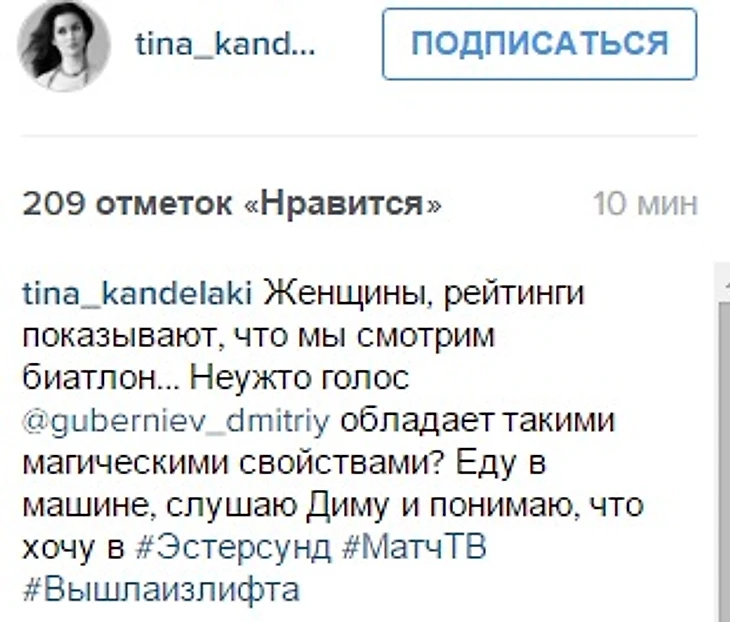 «Женщины, рейтинги показывают, что мы смотрим биатлон... Неужто голос Дмитрия Губерниева обладает такими магическими свойствами? Еду в машине, слушаю Диму и понимаю, что хочу в Эстерсунд», – написала Канделаки.