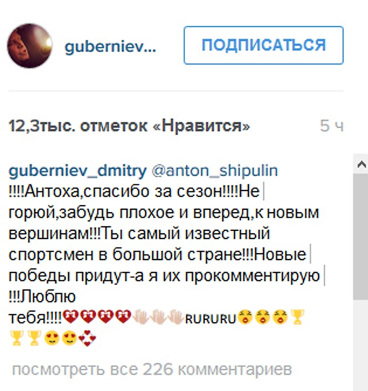 «Антоха, спасибо за сезон! Не горюй, забудь плохое и вперед, к новым вершинам! Ты – самый известный спортсмен в большой стране. Новые победы придут, а я их прокомментирую! Люблю тебя», – написал Губерниев.