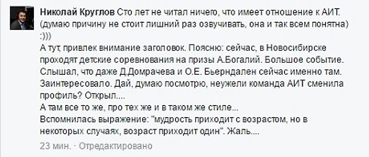 Вспомнилась выражение: «Мудрость приходит с возрастом, но в некоторых случаях возраст приходит один». Жаль...», – написал Круглов.