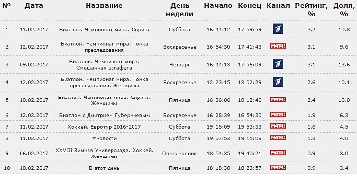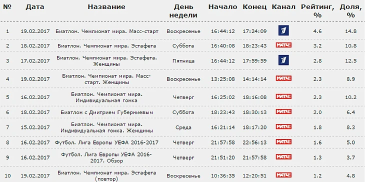 Всего в топ-100 прошлой недели вошло 5 трансляций биатлона – масс-старт и женская эстафета («Первый канал»), мужская эстафета, женский масс-старт и мужская индивидуальная гонка («Матч ТВ»). На первой неделе ЧМ-2017 таких трансляций также было пять – спринт, смешанная эстафета, женский пасьют («Первый канал»), мужской пасьют, женский спринт («Матч ТВ»).