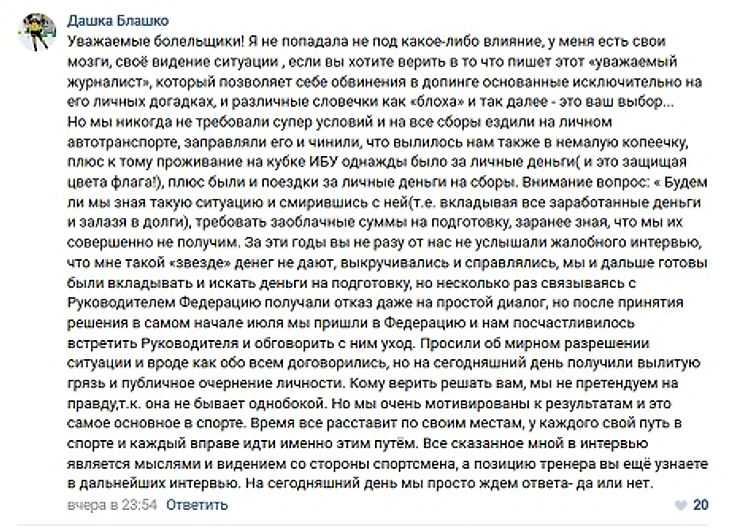 Белорусская биатлонистка Дарья Блашко, прокомментировала слова журналиста «Спортивной панорамы» Руслана Васильева о чрезмерных запросах спортсменки, из-за невыполнения которых она покинула сборную.