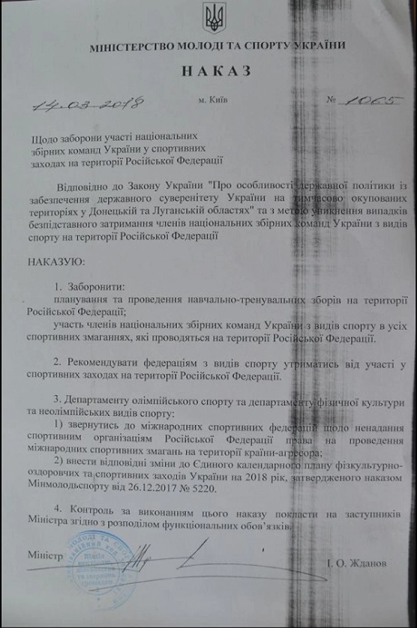 Министр спорта Украины Игорь Жданов подписал указ о запрете участия украинских спортсменов на соревнованиях в России.