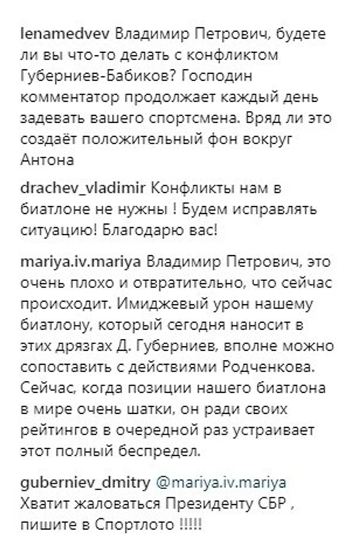 «Хватит жаловаться президенту СБР! Пишите в Спортлото!» – написал Губерниев в инстаграме Драчева.