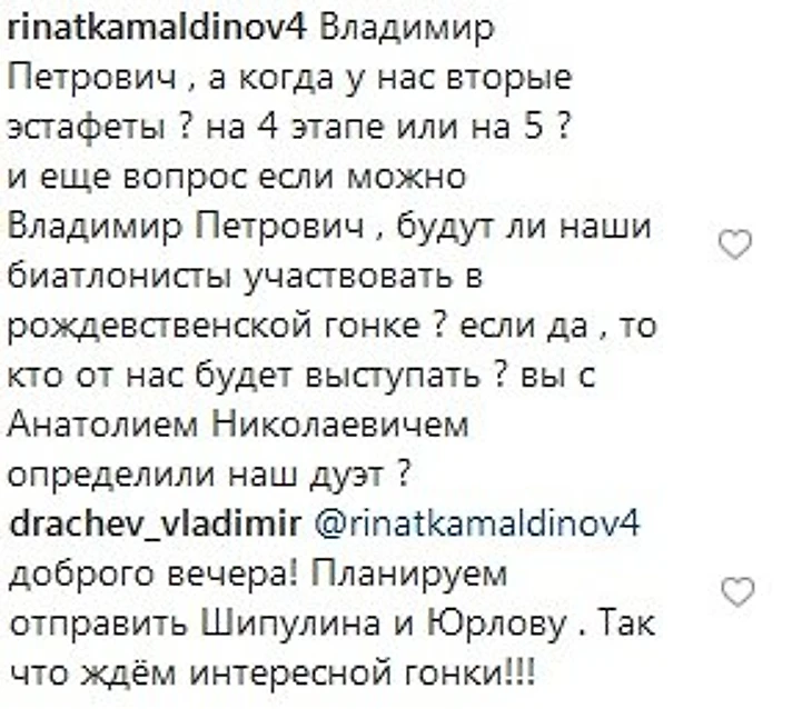 «Планируем отправить Шипулина и Юрлову. Так что ждем интересной гонки!» – написал Драчев.