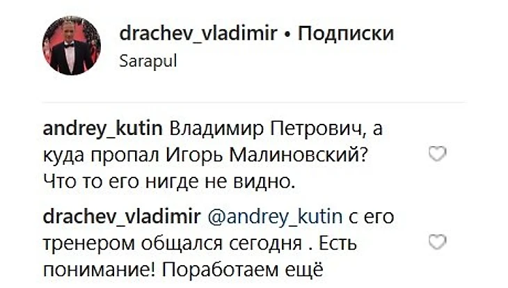 «С его тренером общался сегодня. Есть понимание! Поработаем еще», – ответил Драчев на вопрос подписчика в инстаграме, поинтересовавшегося Малиновским.