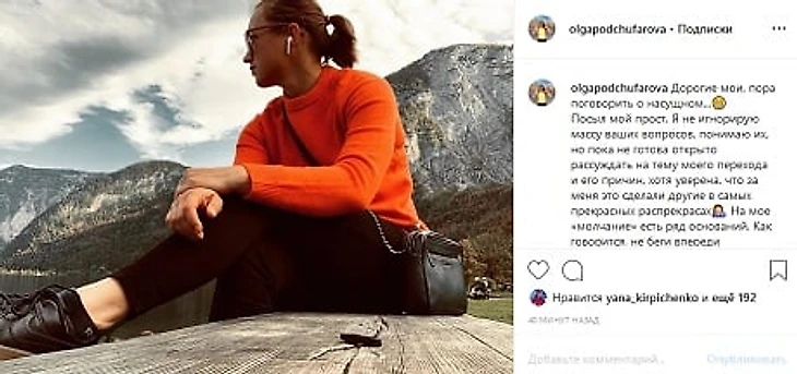 «Дорогие мои, пора поговорить о насущном... Посыл мой прост. Я не игнорирую массу ваших вопросов, понимаю их, но пока не готова открыто рассуждать на тему моего перехода и его причин, хотя уверена, что за меня это сделали другие в самых прекрасных распрекрасах.