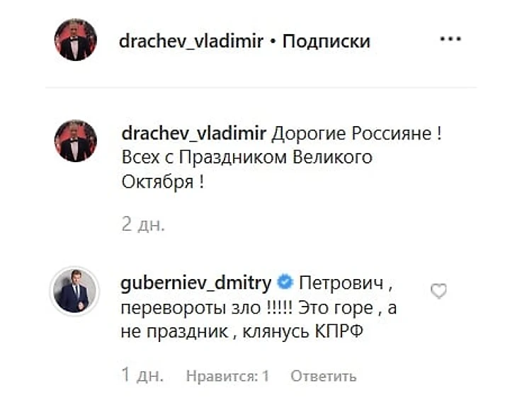 Комментатор Дмитрий Губерниев пошутил в инстаграме президента Союза биатлонистов России (СБР) Владимира Драчева насчет празднования Октябрьской революции.