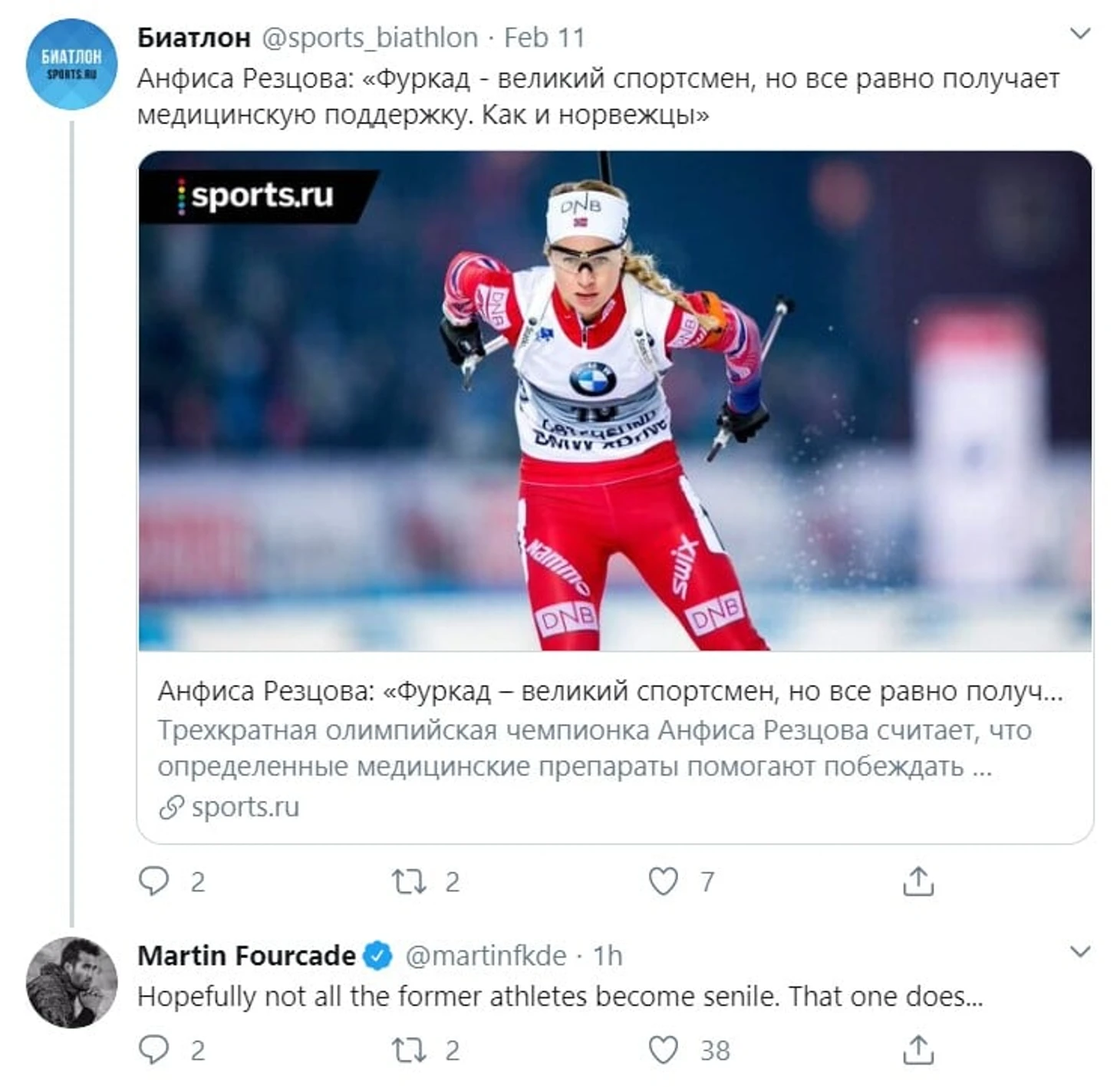 Французский биатлонист Мартен Фуркад отреагировал в твиттере на слова трехкратной олимпийской чемпионки Анфисы Резцовой о себе.