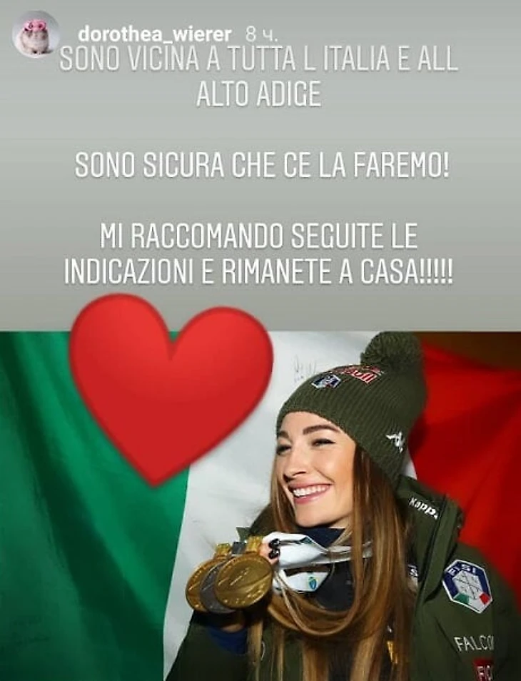 Итальянская биатлонистка Доротея Вирер поддержала соотечественников в связи с ситуацией с коронавирусом в стране.