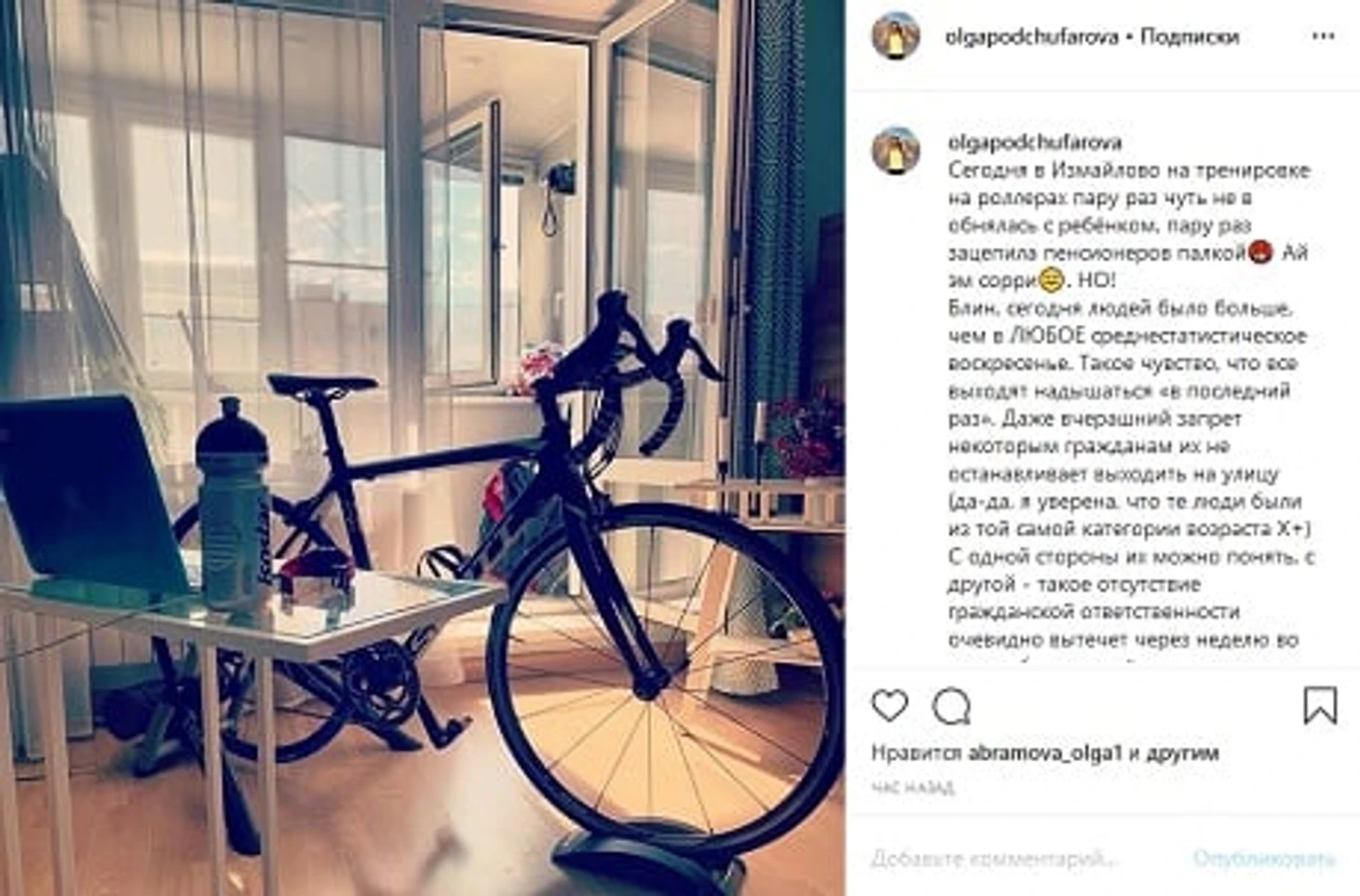 Я обожаю вел, но ненавижу крутить его дома», – написала Подчуфарова.