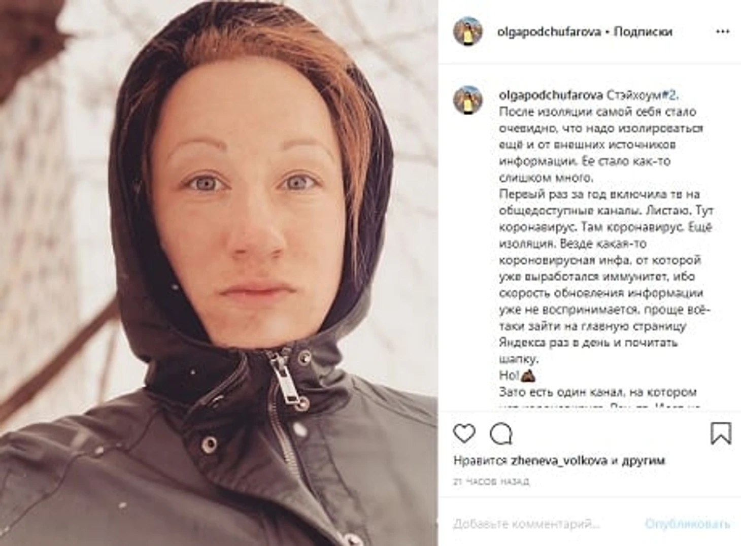 Выработанная привычка изоляции: читать новости раз в день, похоже, вполне достаточно», – написала Подчуфарова.