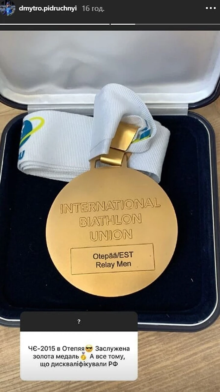 Украинский биатлонист Дмитрий Пидручный получил от Международного союза биатлонистов (IBU) золотую медаль за победу в эстафете на чемпионате Европы 2015 года.