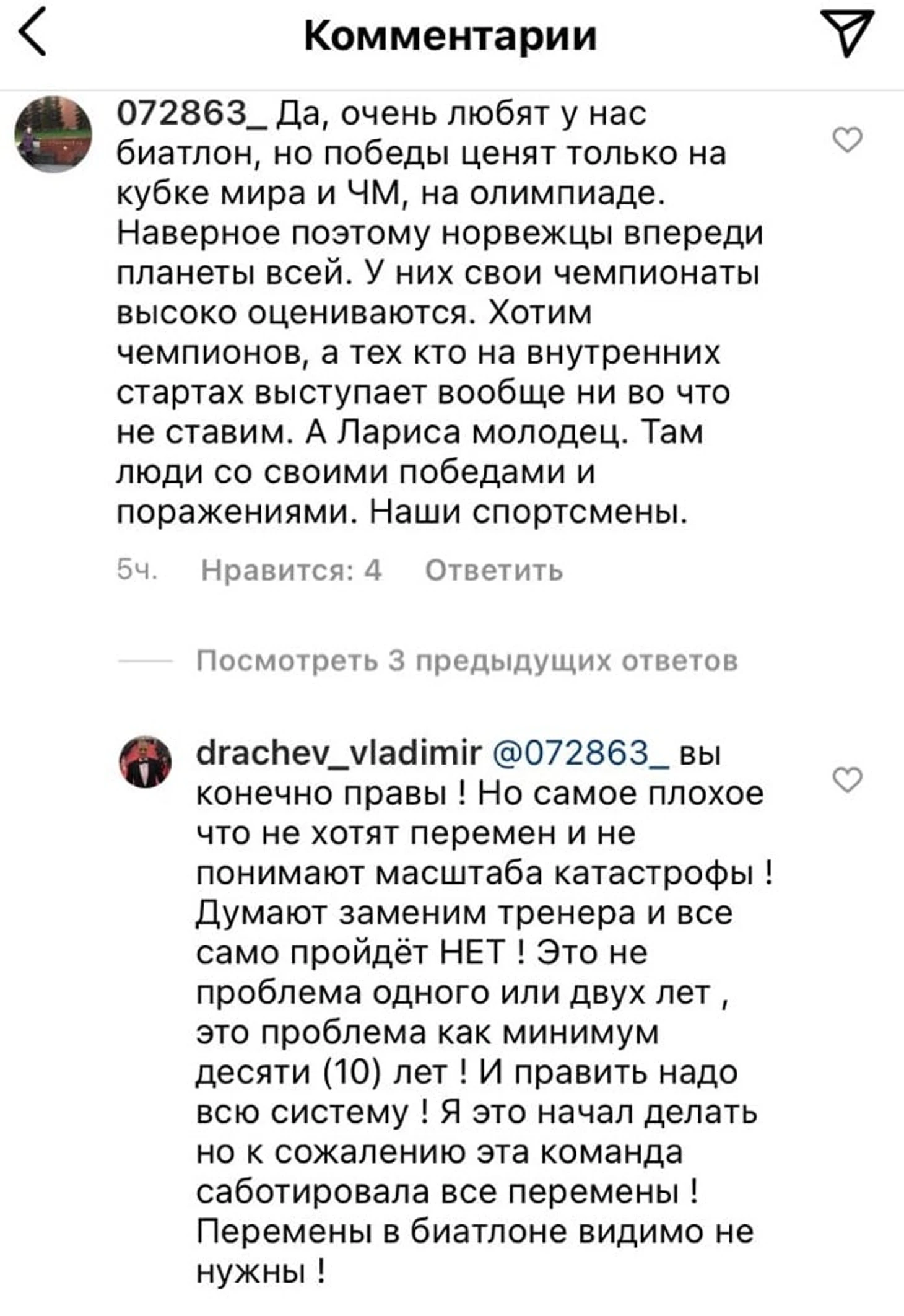 Я это начал делать, но к сожалению, эта команда саботировала все перемены! Перемены в биатлоне, видимо, не нужны!» – ответил Драчев.