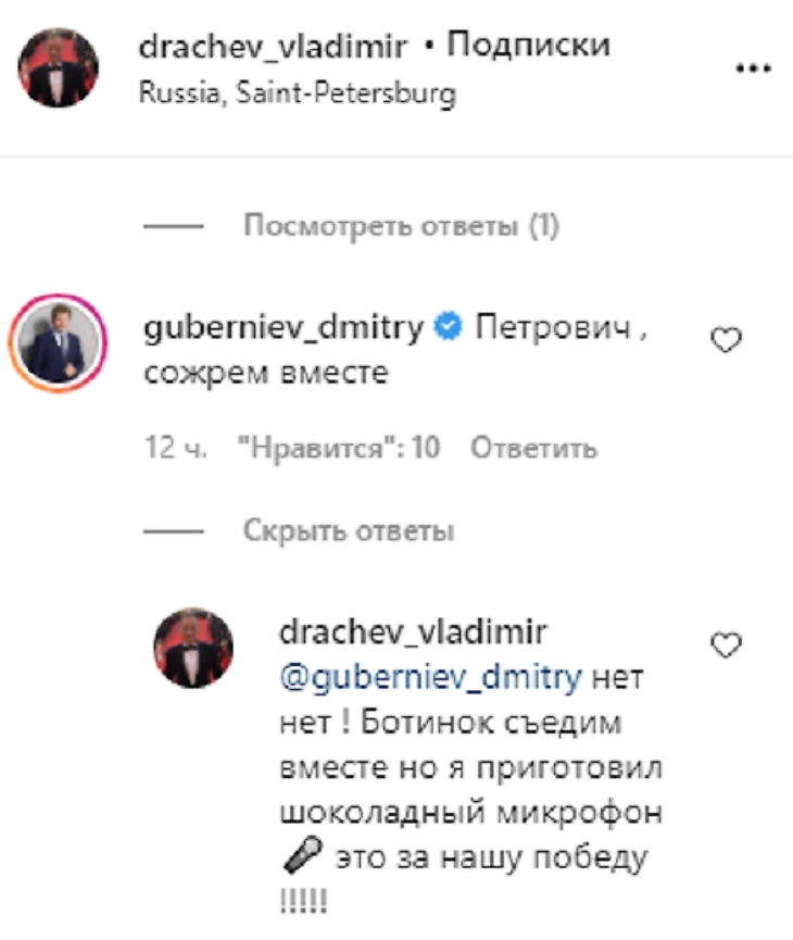 «Петрович, сожрем вместе», – написал Губерниев под постом Драчева в Инстаграм.