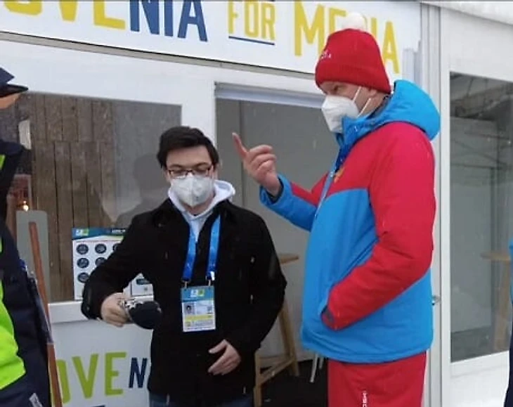 Губерниев пришел к пресс-центру с просьбой дать ему одну чашку чая, но комментатора не пустили внутрь из-за ограничений в связи с пандемией коронавируса.