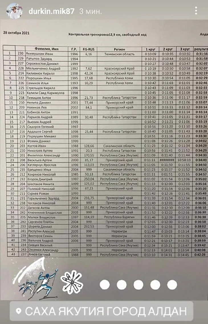 ПРИМЕЧАНИЕ: результаты выложил представитель сервис-бригады сборной России по биатлону Михаил Дуркин, позднее он удалил сторис.