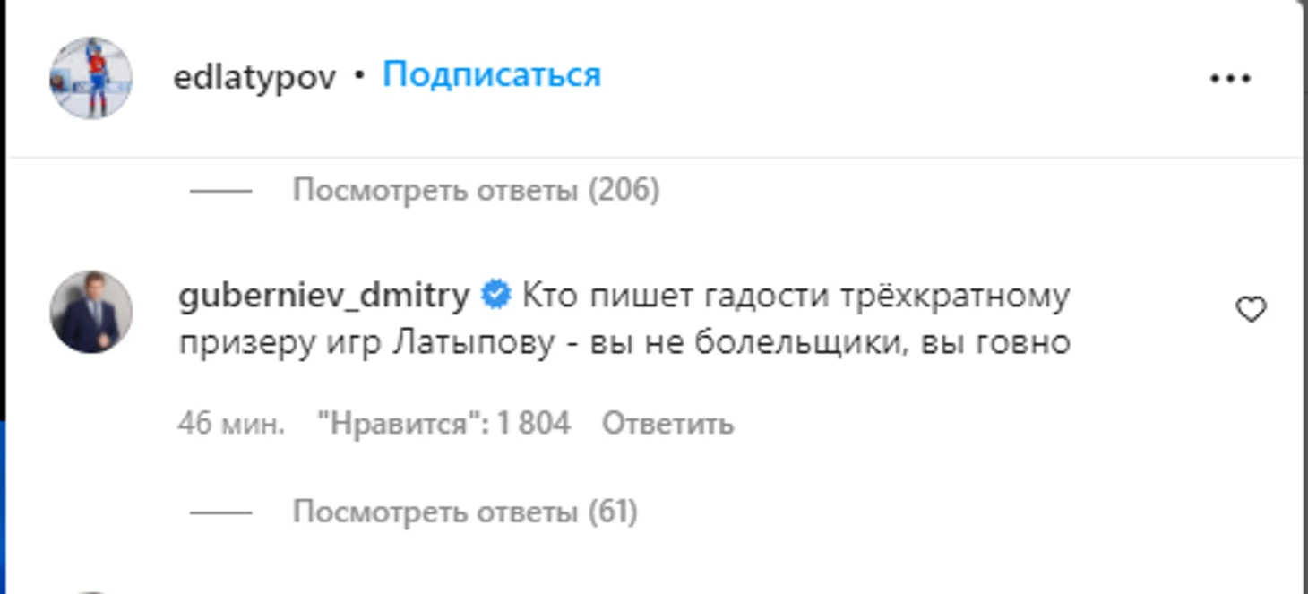 «Кто пишет гадости трехкратному призеру Игр Латыпову – вы не болельщики, вы говно», – написал Губерниев под одним из постов биатлониста в инстаграме.