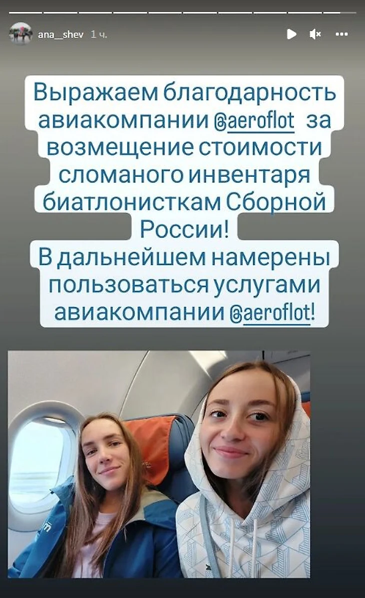 «Выражаем благодарность компании «Аэрофлот» за возмещение стоимости сломанного инвентаря биатлонисткам сборной России! В дальнейшем намерены пользоваться услугами авиакомпании», – написала Анастасия Шевченко.
