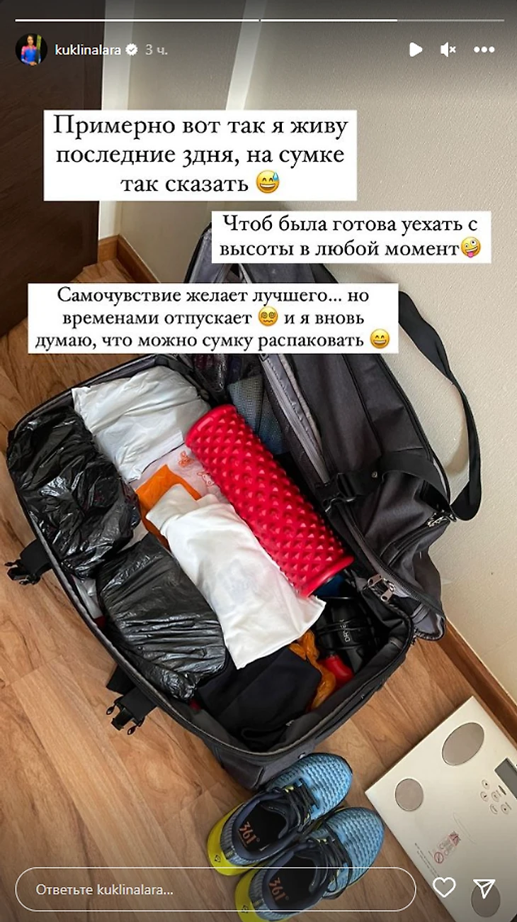 Самочувствие желает лучшего... Но временами отпускает и я вновь думаю, что можно сумку распаковать», – написала спортсменка в сторис.