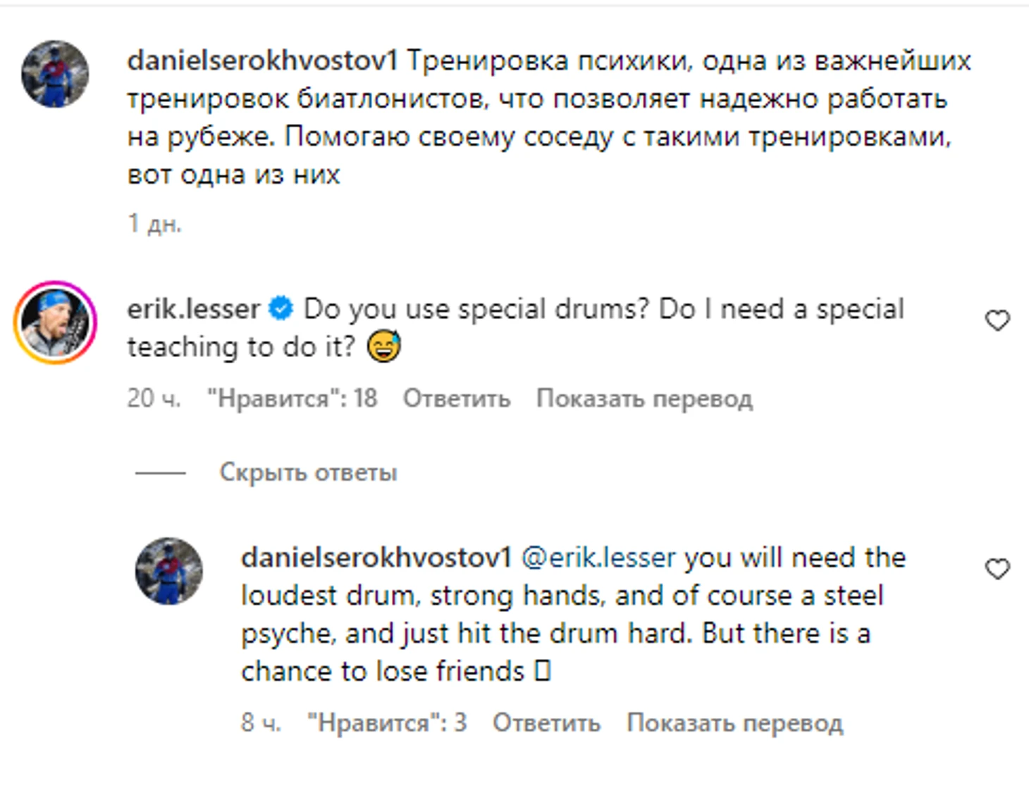 «Тренировка психики – одна из важнейших». Серохвостов показал, как стучит в барабан рядом с Ереминым. Видео прокомментировал Лессер: «Потребуется ли мне обучение?»