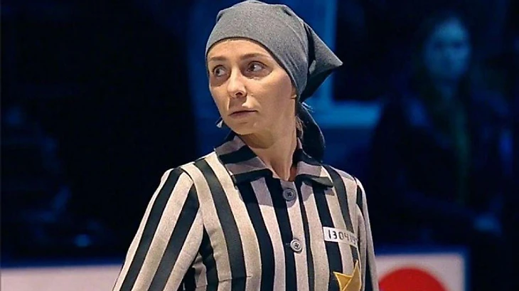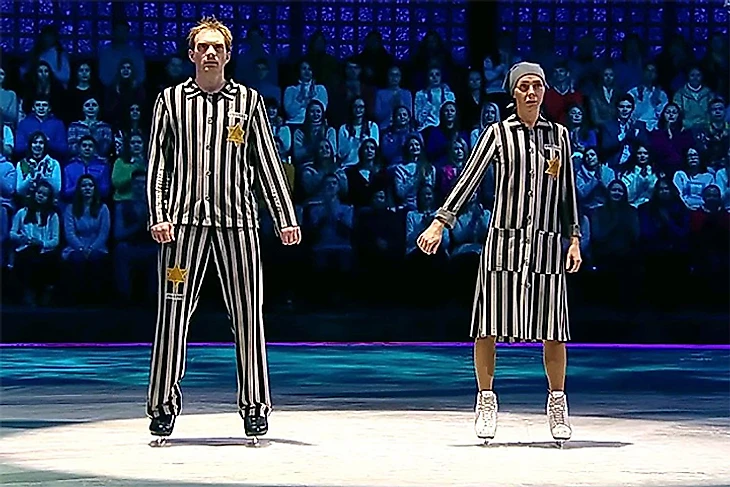 Навка и Бурковский выкатили на лед в полосатых робах узников Освенцима со звездой Давида у сердца. По замыслу, пара скрывает от сына ужасы концлагеря, делая вид, что все в порядке.
