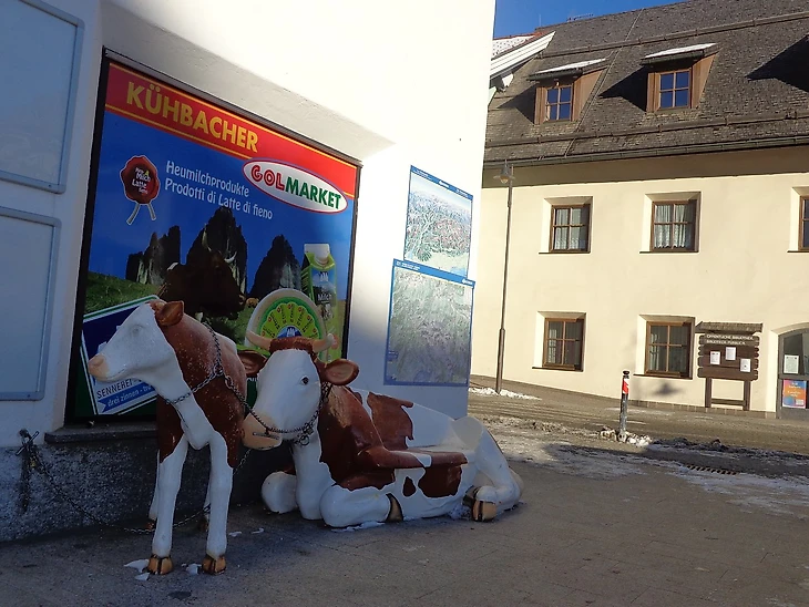 В субботу утром уже Светлана захотела быстренько прогуляться к центру Виллабассы. Я "за") Во второй части рассказа не буду "злоупотреблять" видами милой горной деревеньки, но коровками у одного из магазинов на площади поделюсь) Всё, теперь в Антерсельву, уже на 2 гонки! Билеты у нас на трассу, но во время контактных гонок трасса-то нам больше и нужна! 😉