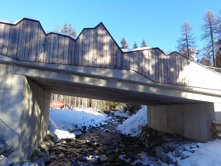 Впрочем, времени у нас было мало, переоделись-переобулись и поехали в Антерсельву на женскую индивидуалку. Всё-таки это было 19 января, Крещение и поэтому первое, что я сфотографировала в этот раз – ручеек под мостиком, по которому идешь на стадион).