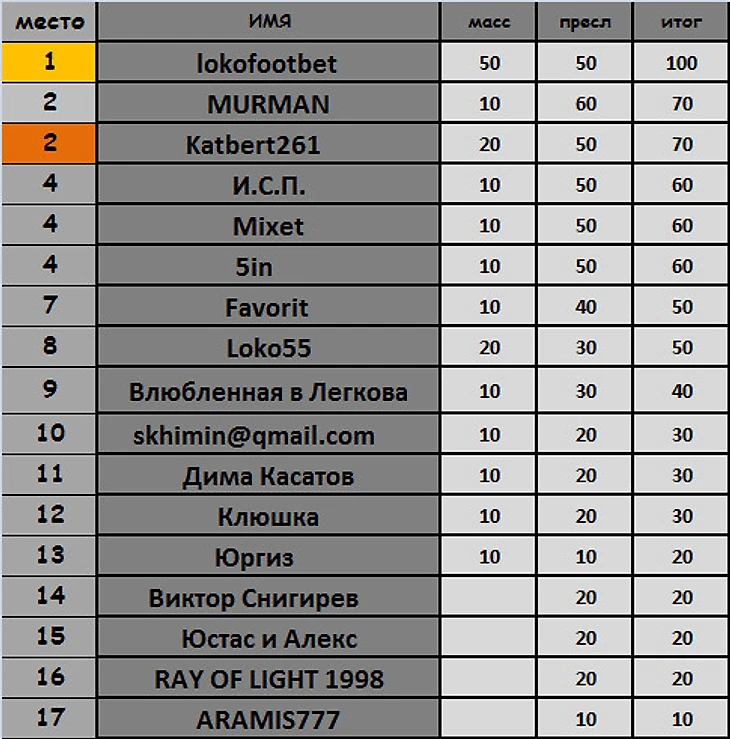 А теперь подробнее об итогах столь удачно сложившейся для сборной России "Рождественской гонке". Сразу приношу извинения за столь позднее подведение итогов. Долго думали с организаторами вообще стои ли их считать. решили засчитать все ставки, в конце-концов эта гока вне зачета, также особого приемущества поставившие после масстарта не получили, и наконец, в канун Нового года можно простить небольшую погрешность )))).